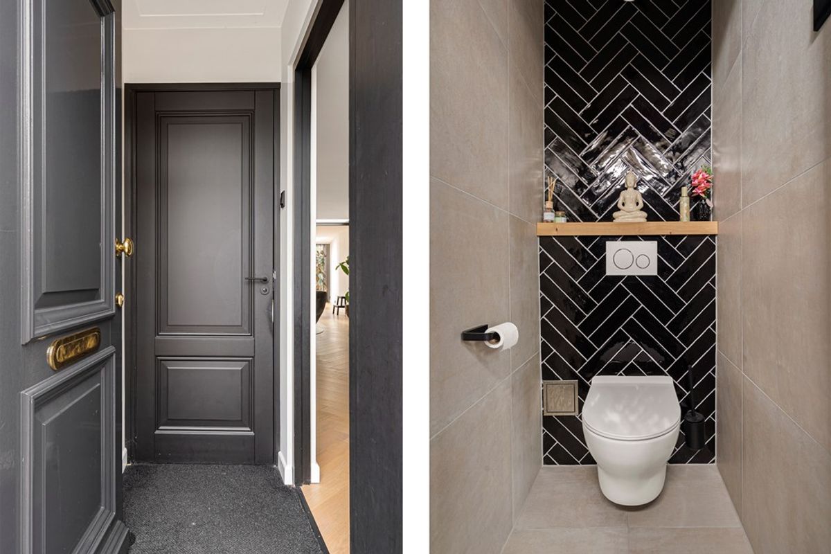Entree via een stijlvolle voordeur naar de ruime hal met uitgebreide meterkast en modern toilet. Vanuit hier betreedt u de zeer royale woonkamer, afgewerkt met een prachtige vloer in visgraat met vloerverwarming, hoge plinten, strakke wanden en plafonds, en sfeervolle shutters.