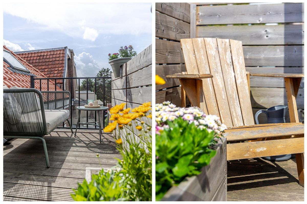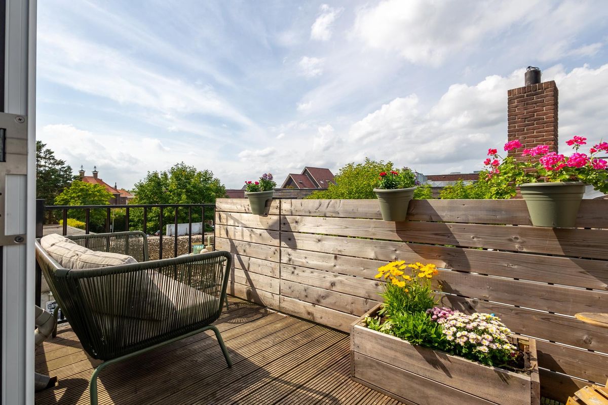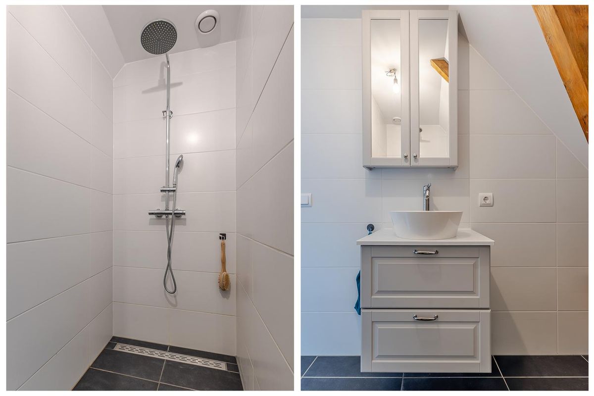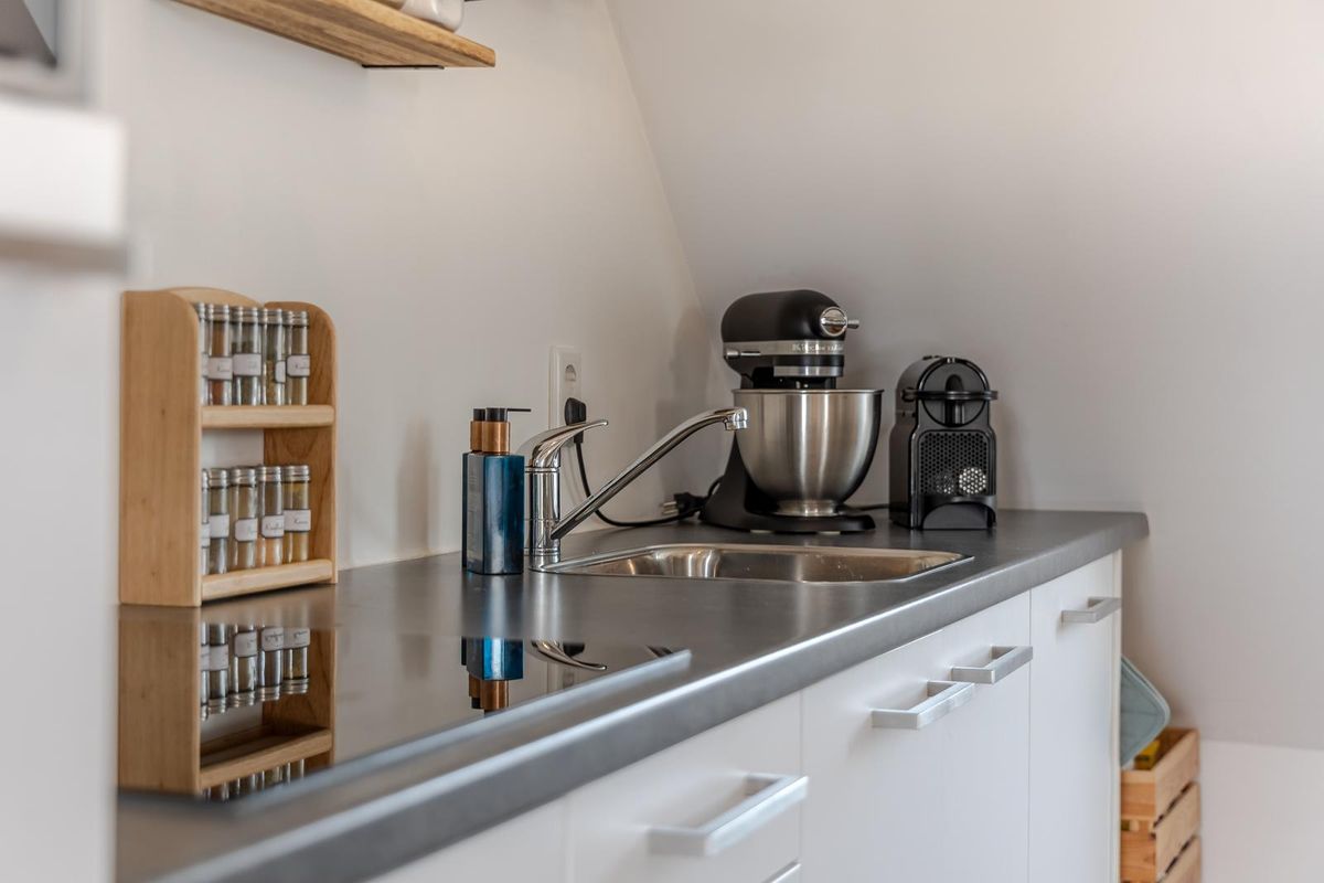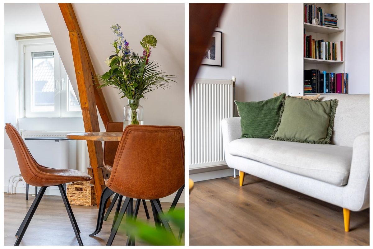 Hal met trap naar de woonverdieping. Onder de schuine kap is er aansluiting voor de wasapparatuur en aan de andere kant de meterkast en het toilet. Het appartement beschikt over een lichte woonkamer met sfeervolle houten balken. Er is een open keuken, wat zorgt voor een fijne leefruimte. De indeling is efficiënt en er is een slaapkamer met toegang tot de badkamer. De badkamer is netjes en compleet met een douche en wastafel. Boven de badkamer is een bergzolder gerealiseerd. Deze is toegankelijk via een luik in de woonkamer. Een extra pluspunt is het balkon, gesitueerd op het westen. Hier kun je na een drukke werkdag en de laatste zonnestralen meepikken!