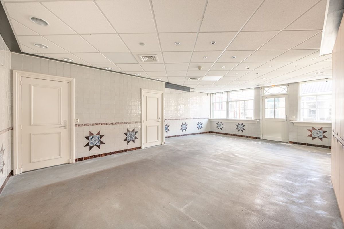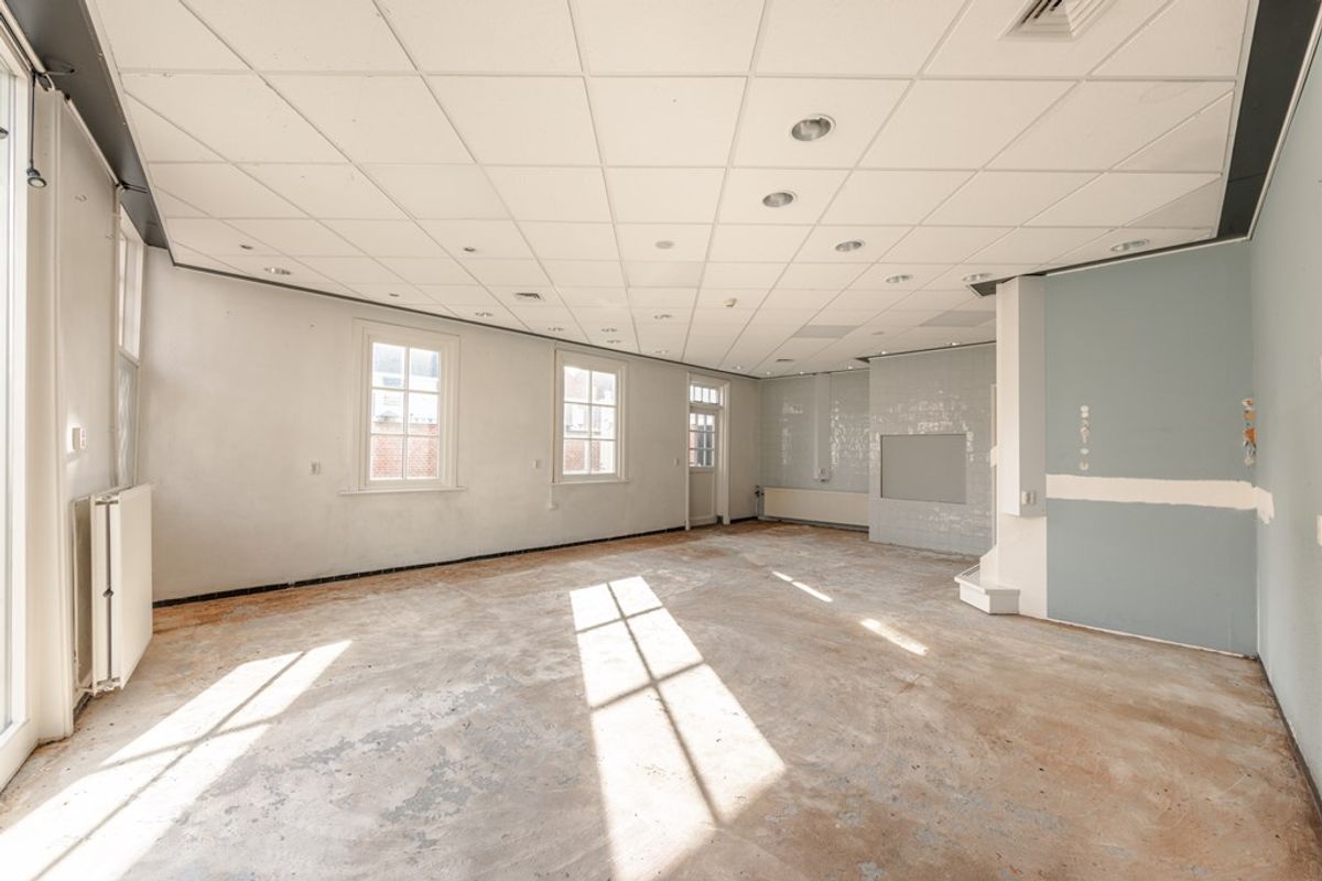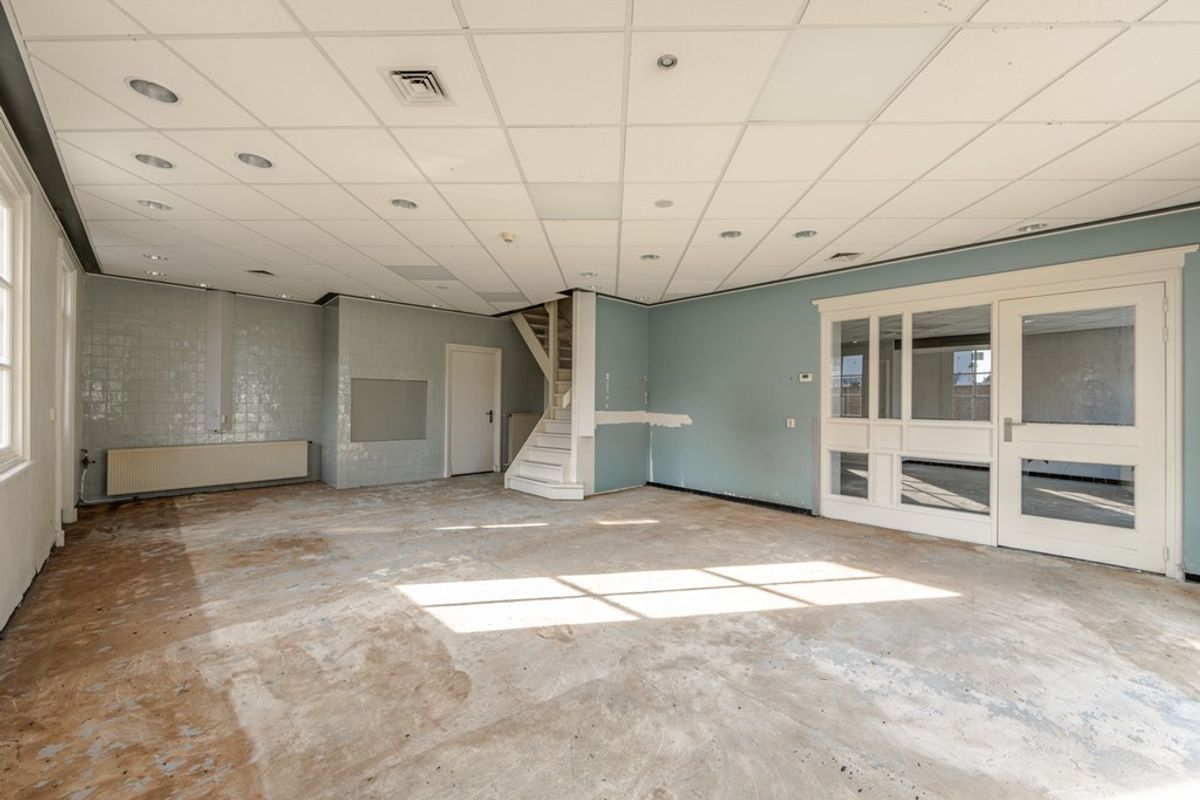 Op de eerste verdieping is nu de woonkamer met de halfopen keuken. Dat is vroeger ook kantoorruimte geweest. Via een doorloop, met een deur naar het terrasje op het westen, kom je in een ruimte die voorheen als vergaderruimte werd gebruikt, maar die ook prima als slaapkamer kan dienen.