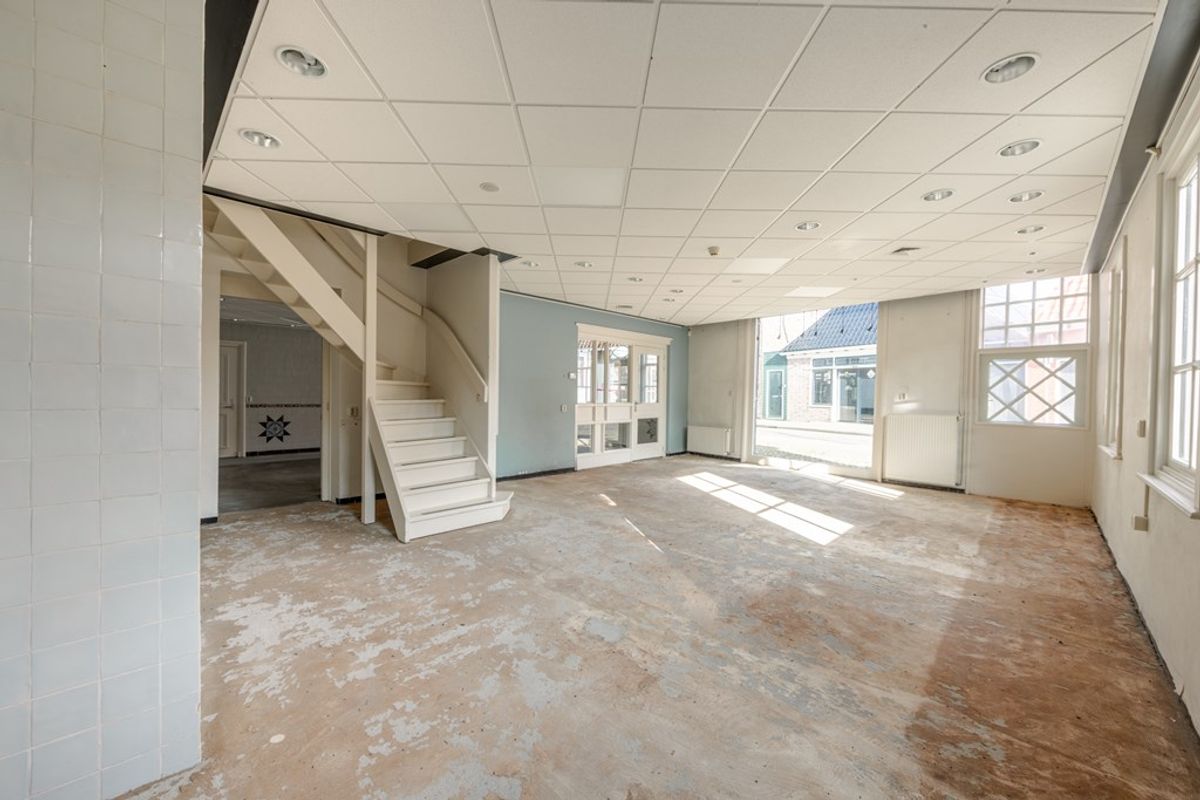 En dan ook nog eens op deze toplocatie, midden in het gezellige dorpscentrum. Aan de voorzijde vind je een entree naar de voormalige winkel, met mooie Makkumer aardewerktegels van Tichelaar. Deze ruimte is nog helemaal naar eigen wens in te vullen. Bijvoorbeeld met een woonkeuken en woonkamer, of juist weer als winkel- en/of kantoorruimte. Zie de artist impressions bij de foto’s en in de video. Je kunt ook via de achterzijde binnenkomen, via een gang met keuken. En je kunt op twee manieren naar boven. Je kunt de panden dus zowel verticaal als horizontaal indelen.