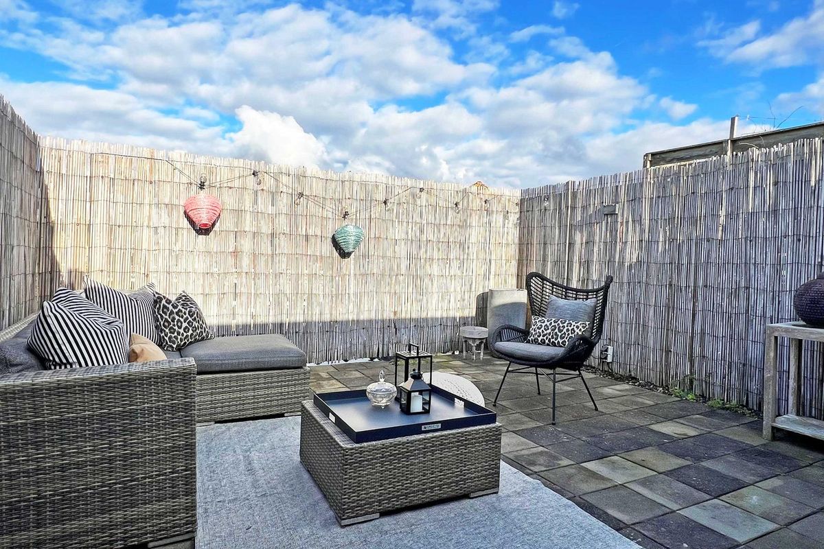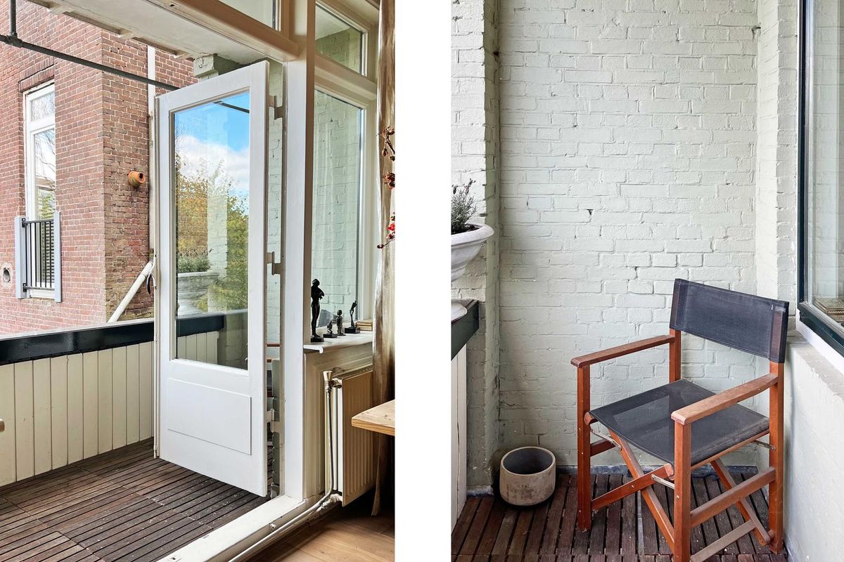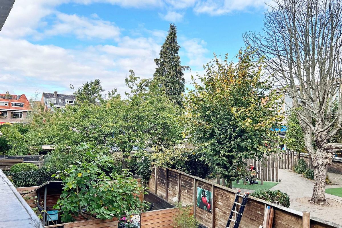 Open lichte ruimte door de dakopbouw van 13m2, met een beschut dakterras. Hier geniet u van de zon en het uitzicht op de historische Hillegondakerk.