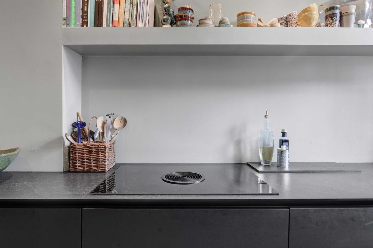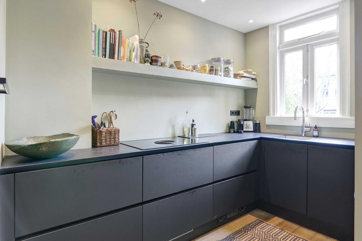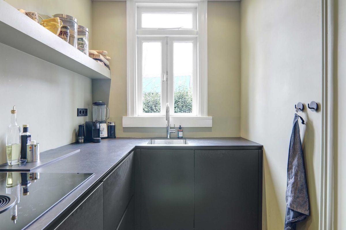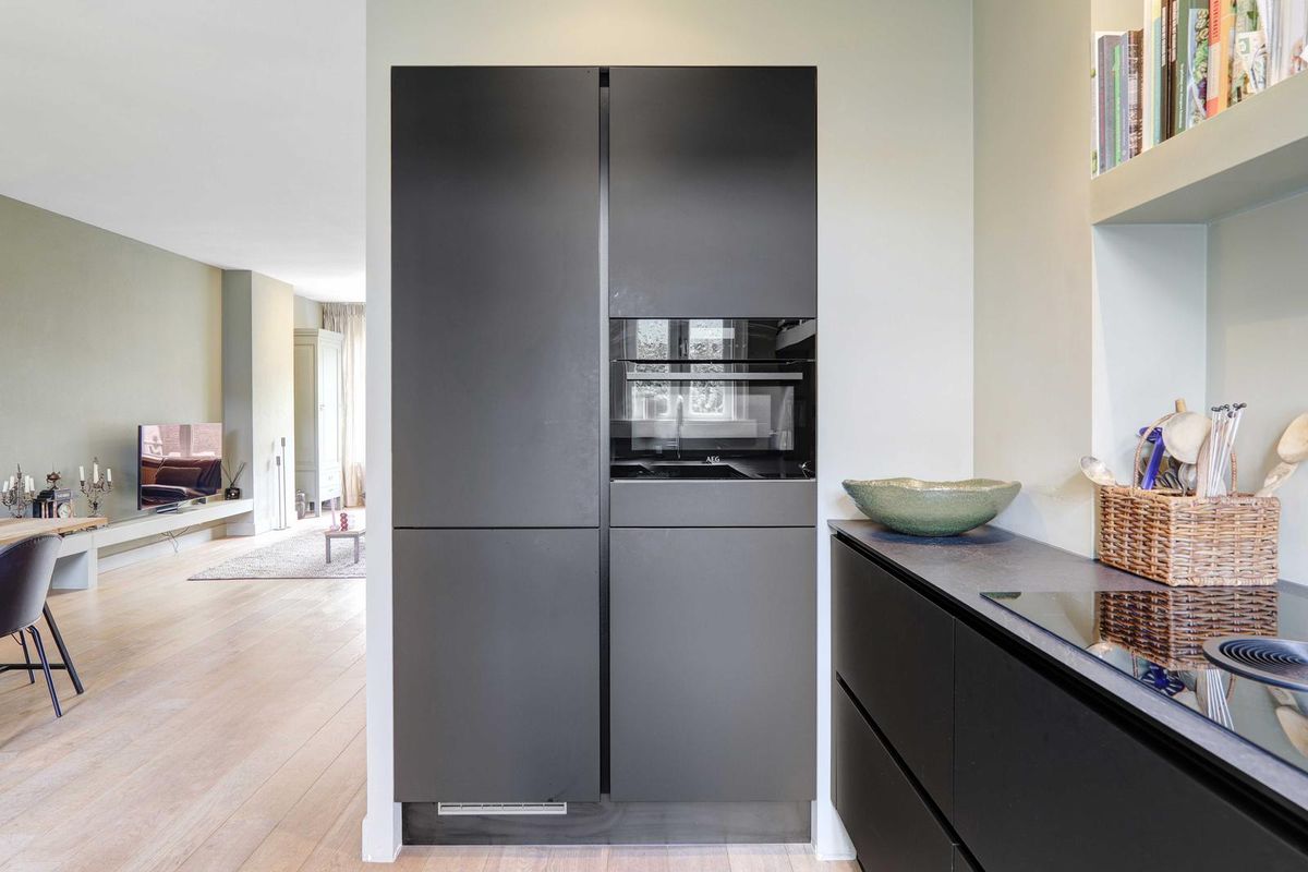Overloop, zwart en wit betegeld toilet en trap naar de 2de verdieping. De aandacht wordt direct getrokken door het met smaak ingerichte leefgedeelte, wat bestaat uit de royale woonkamer aan de voorzijde en de eetkamer aan de achterzijde met deuren naar het balkon. De halfopen keuken is in een L-vorm opstelling zwart uitgevoerd voorzien van koel/vries combinatie, oven, inductie kookplaat met ingebouwde afzuiging. De zijkamer aan de voorzijde is in gebruik als werkkamer.