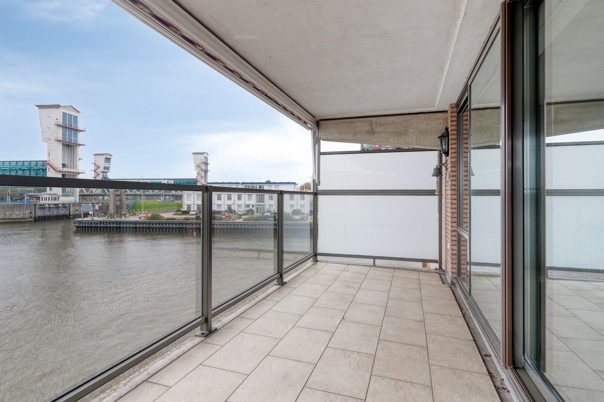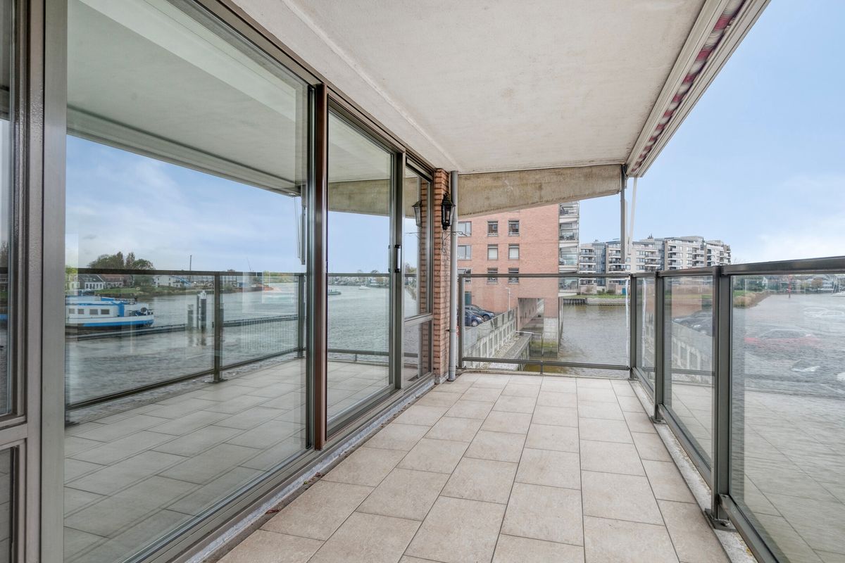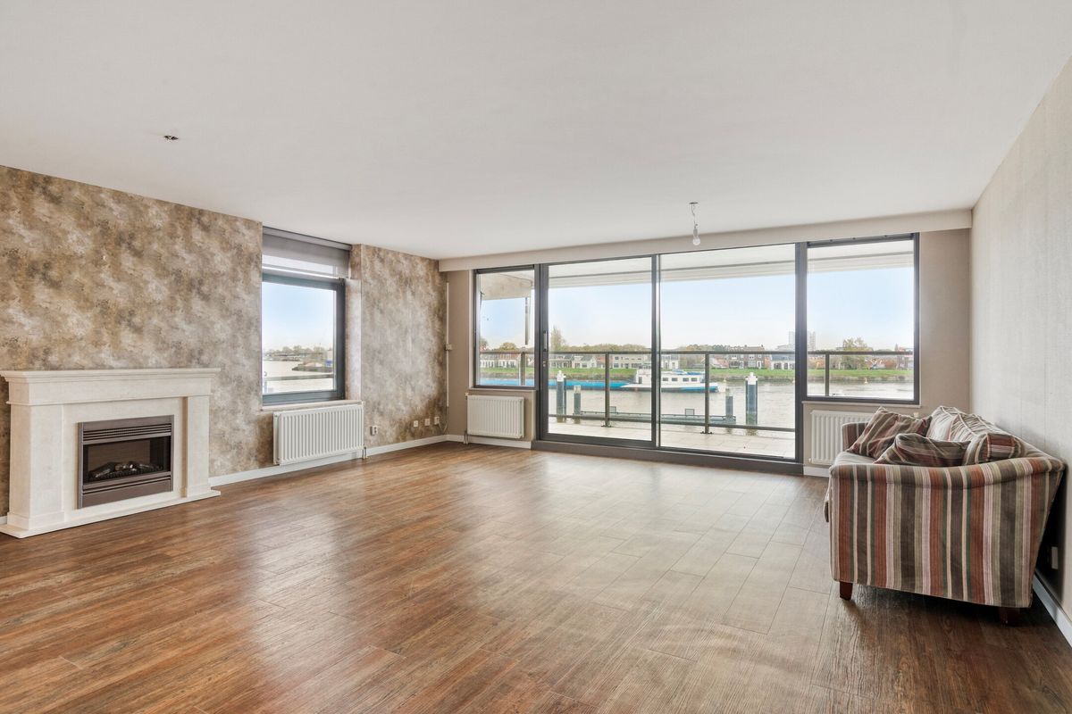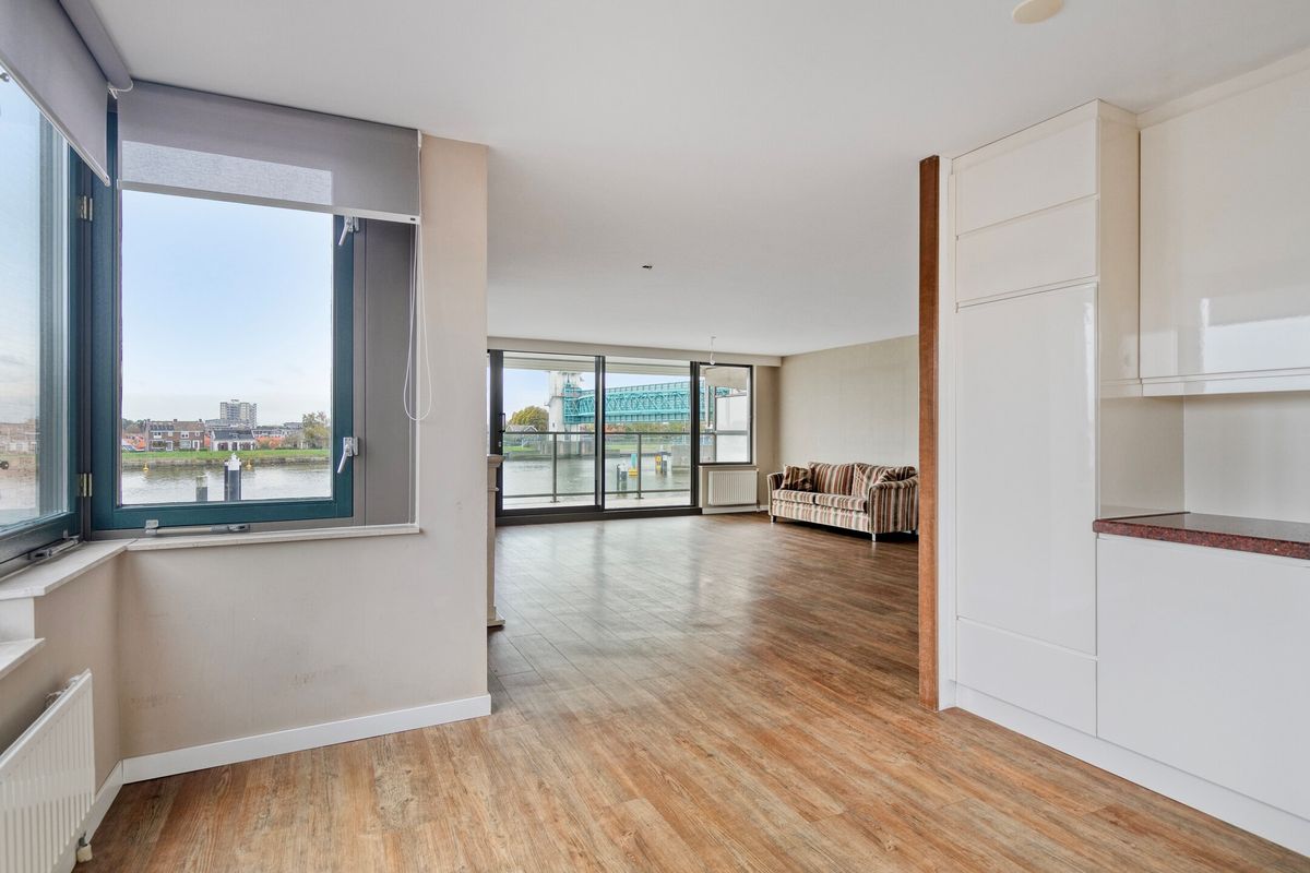 Woonkamer, een royale en opvallend lichte woonkamer met prachtig uitzicht over de rivier. De kamer bevat een zijraam en biedt verder toegang tot de open keuken en het ruime balkon via een brede schuifdeur.