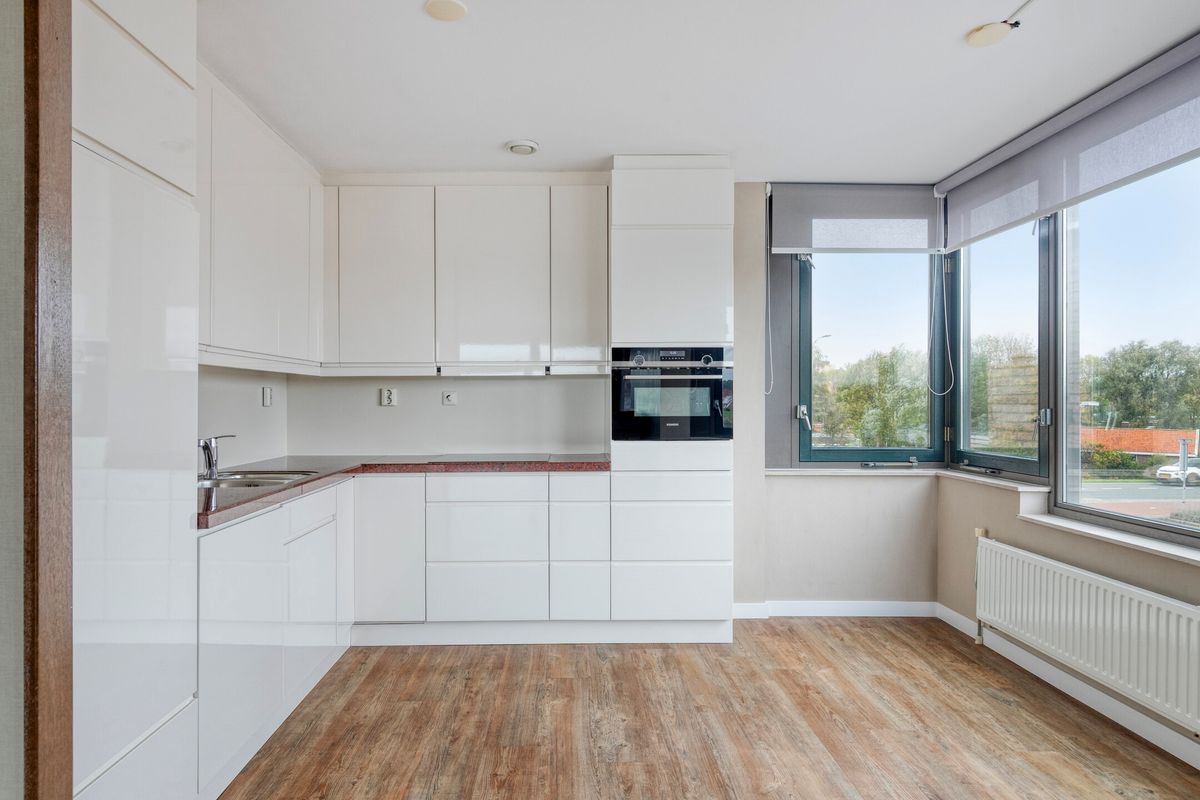 Keuken, voorzien van een speelse erker (met fraai uitzicht!) en een keukenblok in L-vormige opstelling met een inductie kookplaat en afzuigkap, koelkast, combi-oven en vaatwasser.