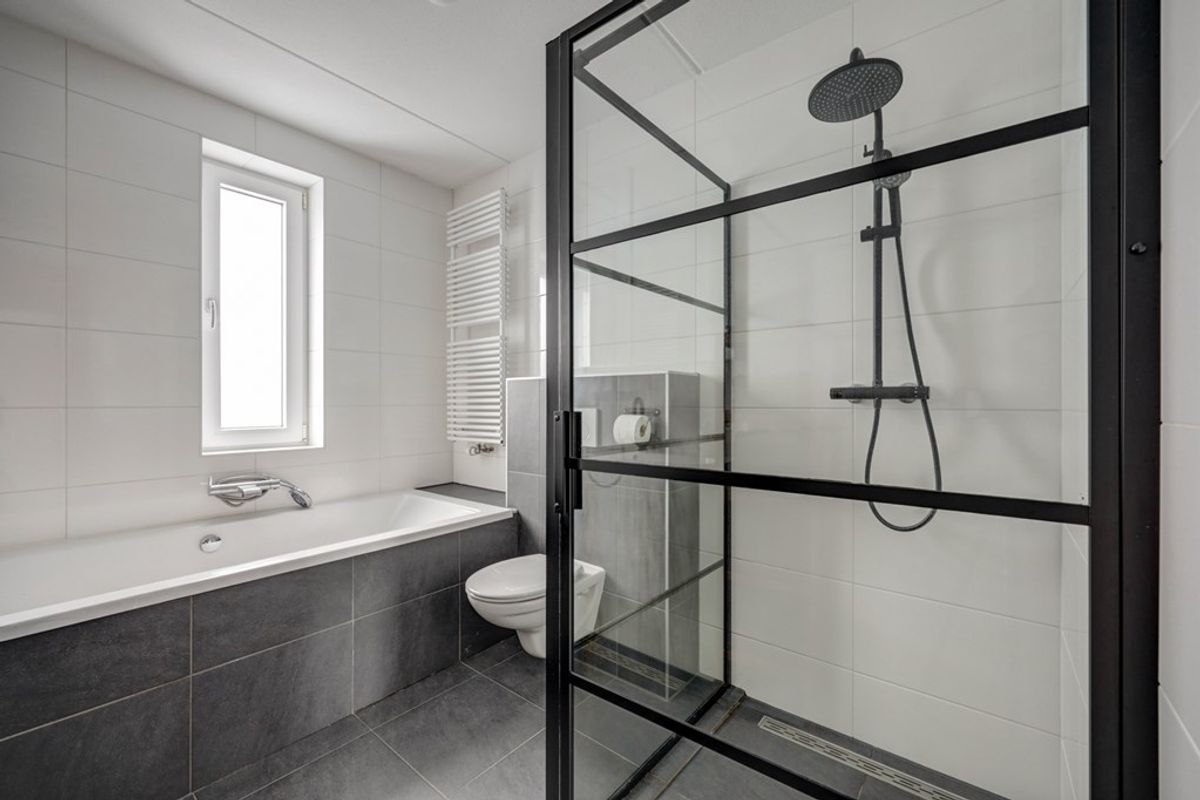 Op de 1e verdieping zijn 2 ruime slaapkamers (voorheen 3) en de badkamer. Eén slaapkamer is voorzien van een Frans balkon en een inloopkast. In alle slaapkamers en op de overloop ligt een mooie laminaat vloer. Over dit huis valt echt niets op te merken. En al helemaal niet over de badkamer. Wat een prachtige ruimte is dit, en zo compleet! Zo is er een ruim ligbad, een inloopdouche, een wastafelmeubel, een vrijhangend closet en een designradiator.