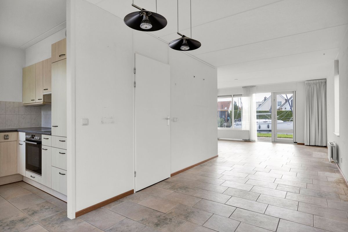 Nadat we de auto geparkeerd hebben op eigen erf, of als je met de boot komt, dan leg je deze aan aan de eigen steiger, betreden we de woning aan de voorzijde en komen in de hal met meterkast, toilet en trapopgang, tevens is er toegang tot de L-vormige woonkamer. De woonkamer is heerlijk licht en heeft een openslaande deur naar het terras en achtertuin op het zuiden. De open keuken is gesitueerd aan de voorzijde en heeft een hoekopstelling met vrijstaande kast, de keuken is voorzien van diverse inbouwapparatuur zoals; close-in-boiler, koelkast, vrieskast, combimagnetron, inductie kookplaat, afzuigkap en vaatwasser.