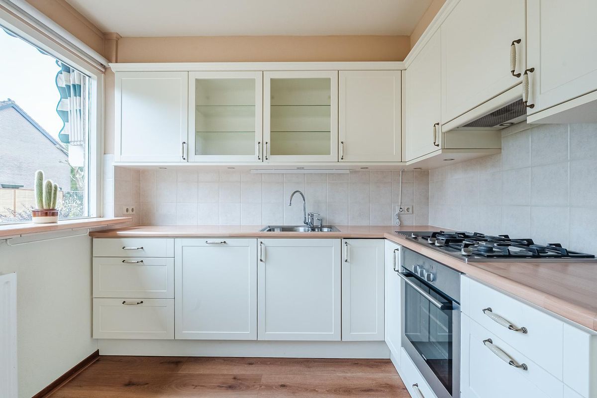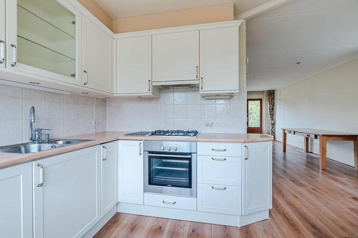 Aan de voorzijde bevindt zich de halfopen keuken, uitgevoerd in een lichte kleurstelling en voorzien van diverse inbouwapparatuur zoals een gaskookplaat, afzuigkap, oven en koelkast.