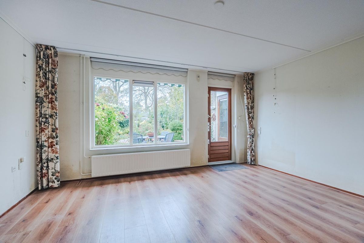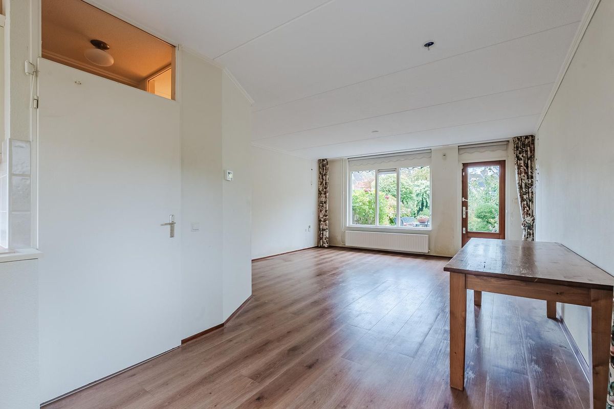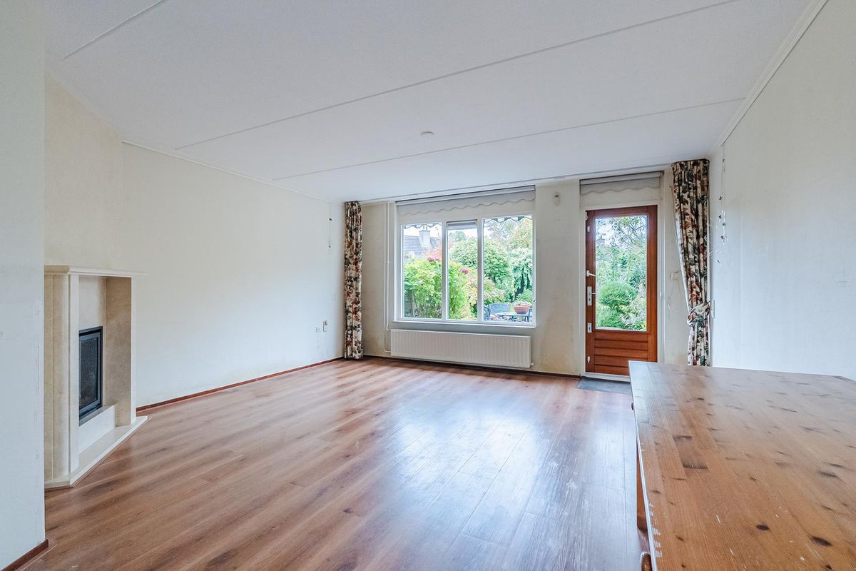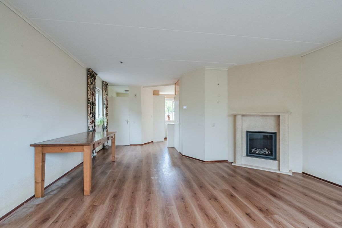 Entree met meterkast en garderobe. Toegang tot de lichte woonkamer. Dankzij de raampartijen valt hier lekker veel daglicht binnen en is er een prettige verbinding met de tuin. De woonkamer biedt voldoende ruimte voor een royale zithoek in de nabijheid van de gashaard en een grote eettafel.