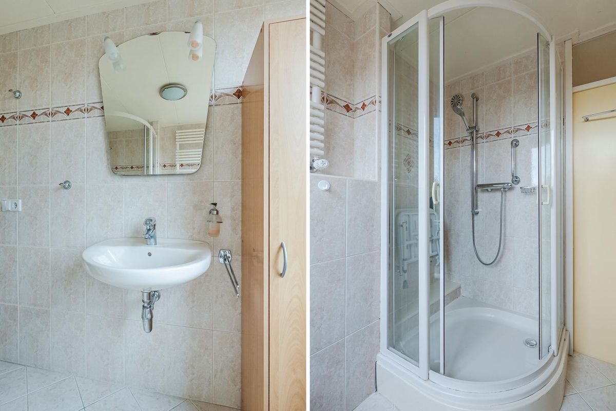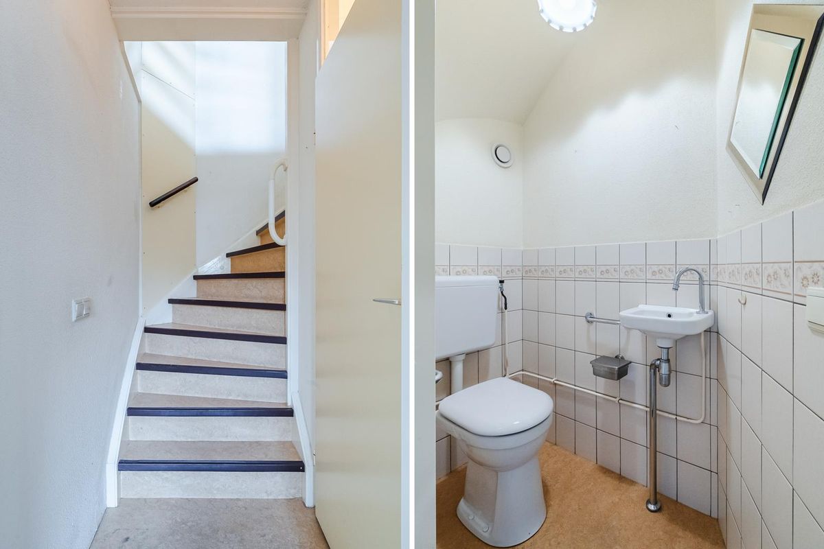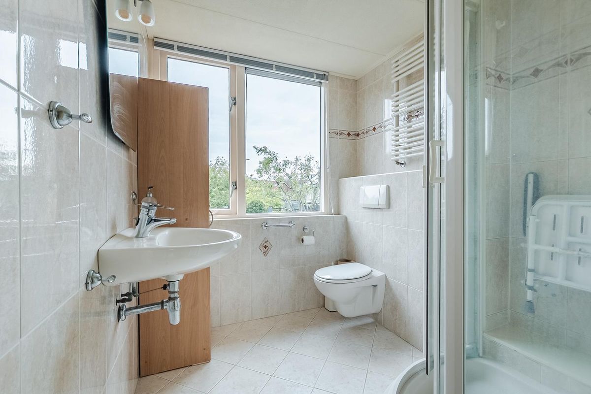Overloop met trapgang naar de tweede verdieping en toegang tot de 3 slaapkamers en de badkamer. Alle kamers zijn goed van formaat en hebben een fijne lichtinval. Door de dakkapellen op zowel de voor- als achterzijde is er meer leefruimte ontstaan. De badkamer is compleet uitgerust met een douche, wastafel, zwevend toilet en een raam voor natuurlijke ventilatie.
