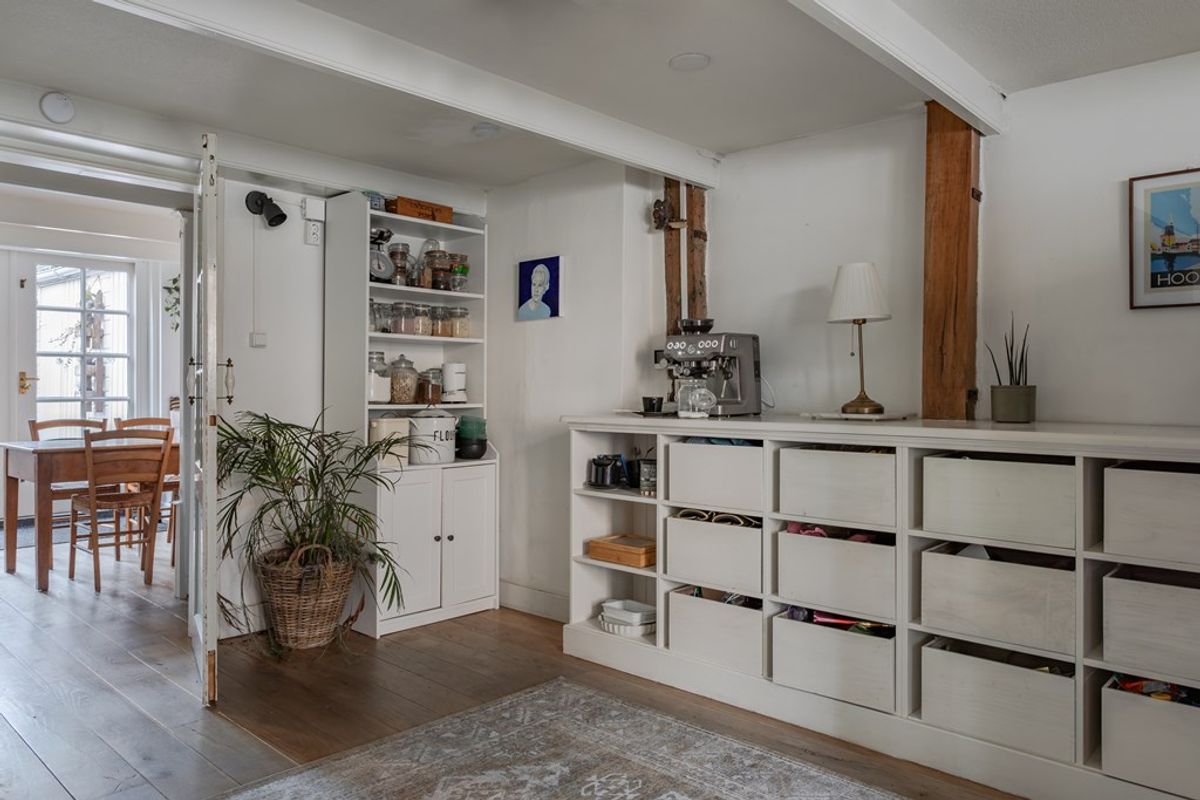 De gevel van dit bijzondere pand heeft een snijvoeg en bovenaan pronkt een fraaie klokgevel. Als u door de voordeur stapt wordt u verwelkomt door een prachtige leefruimte met hoog plafond met de vloerbalken in het zicht, alsmede de vide. Hoge roederamen met enkel glas geven veel lichtinval en in de zomer kunnen de elektrisch te bedienen markiezen worden uitgezet. Op de vloer ligt een massief eikenhouten vloer. Om de radiatoren zit een ombouw, vaste hoge kasten sieren de wanden en er zit een oude schouw met antieke tegeltjes die ook als drempels zijn geplaatst. Een lust voor het oog! In het vaste dressoir zit enorm veel bergruimte en en-suite deuren geven toegang tot de gezellige woonkeuken.