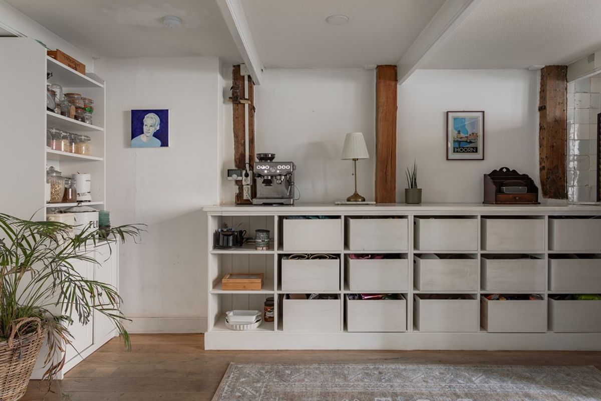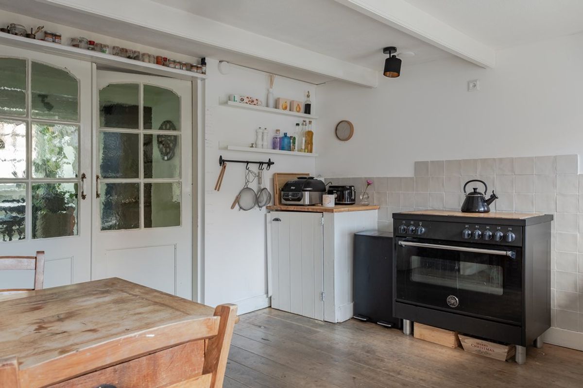 Juist de eenvoud siert deze gezellige woonkeuken waar je bijna verwacht dat Swiebertje en Saartje aan tafel zitten! De massief houten vloer is hier doorgelegd, er is een keukenblok met diep houten werkblad, porseleinen spoelbak, met witjes betegelde wand, de vaatwasser is 2½ jaar oud, de koelkast staat los in een hoek en koken kunt u op het Bertazzoni inductiefornuis met 5 zones en brede oven, ook 2½ jaar oud. Er is een vaste kast voor de wasmachine. Bij de eettafel is een zitplateau over de radiator geplaatst en openslaande deuren met roederamen geven toegang tot de sfeervolle tuin.