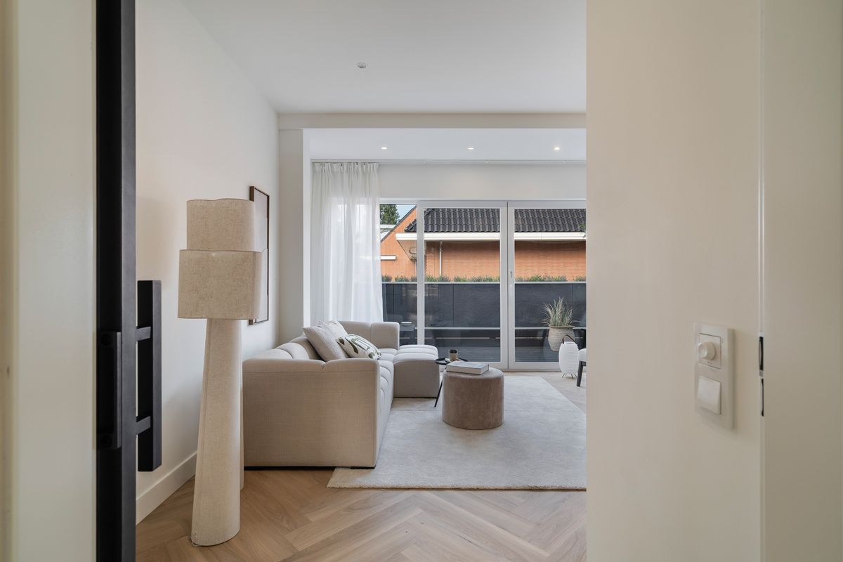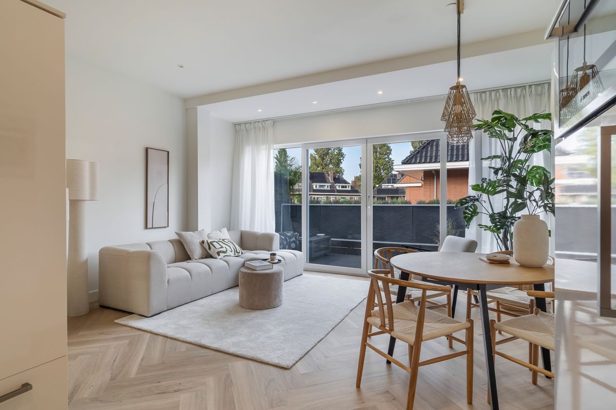 Via de eigen trapopgang bereik je de eerste verdieping, waar de overloop toegang biedt tot de praktisch ingedeelde vertrekken. De woonkamer beschikt over een luxe inbouwkeuken met koelkast, vriezer, inductiekookplaat en vaatwasser. Door de grote raampartijen in de woonkamer, beschikt de woning over veel daglichttoetreding en op het ruime terras  op het zuiden kan je in de ochtend- en avondzon in de rust genieten. Via de overloop kom je langs het separate toilet en is er toegang tot de ruime hoofdslaapkamer met luxe afgewerkte ensuite badkamer, welke overigens ook via de overloop te betreden is. De badkamer beschikt over een inloopdouche, wastafel en kastruimte. Ook beschikt de eerste verdieping over een tweede volwaardige slaapkamer, die ook prettig in te delen is als werkruimte.