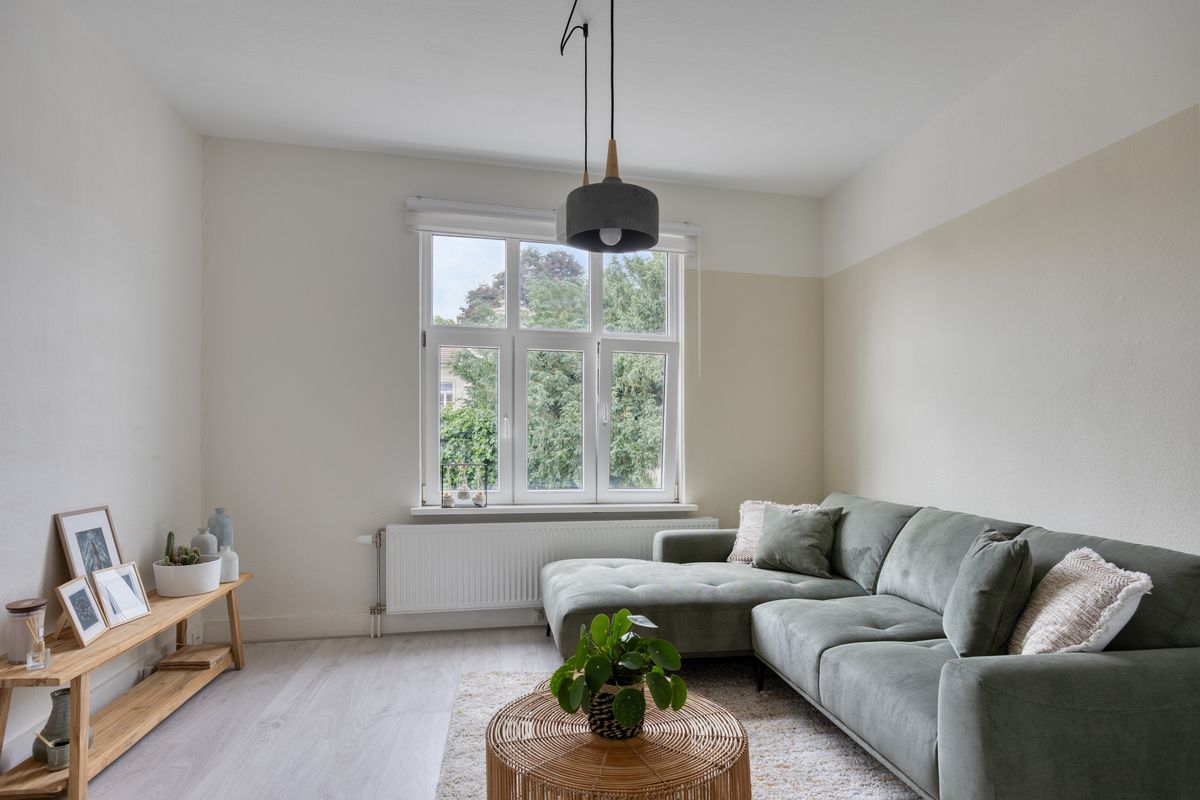 De woonkamer is aan de voorzijde gelegen en is dankzij de grote en hoge raampartij aangenaam licht, met bovendien een leuk uitzicht op de straat. De natuurstenen schouw kan eventueel weer in gebruik worden genomen als (sier)haard.