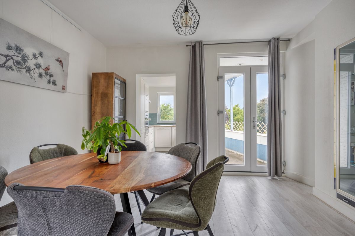 De eetkamer biedt voldoende ruimte voor een goede eettafel en heeft openslaande deuren naar het balkon. Het overdekte balkon, gelegen op het oosten, geeft een mooi en vrij uitzicht over de omgeving. Hier is voldoende plek voor een kleine buitentafel of loungehoek.
