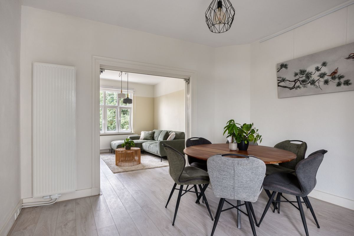 De voormalige en-suite woonkamer is in stand gehouden en deels gemoderniseerd, wat zorgt voor een speelse verdeling in woon- en eetkamer.