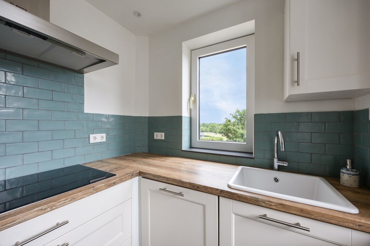 De keuken bevindt zich aan de achterzijde van de woning en is uitgevoerd in een neutrale hoekopstelling. De aanwezige apparatuur bestaat uit een oven, 5-pits inductiekookplaat, afzuigkap, koel-/vrieskast en vaatwasmachine, alle van het merk Bosch. Dankzij de twee ramen is er een fraai uitzicht over de omgeving en een prettige lichtinval.
