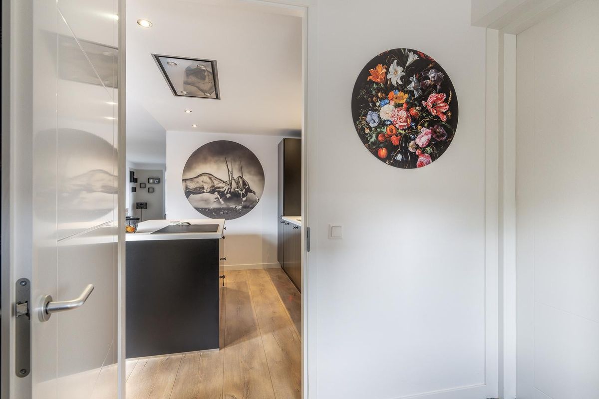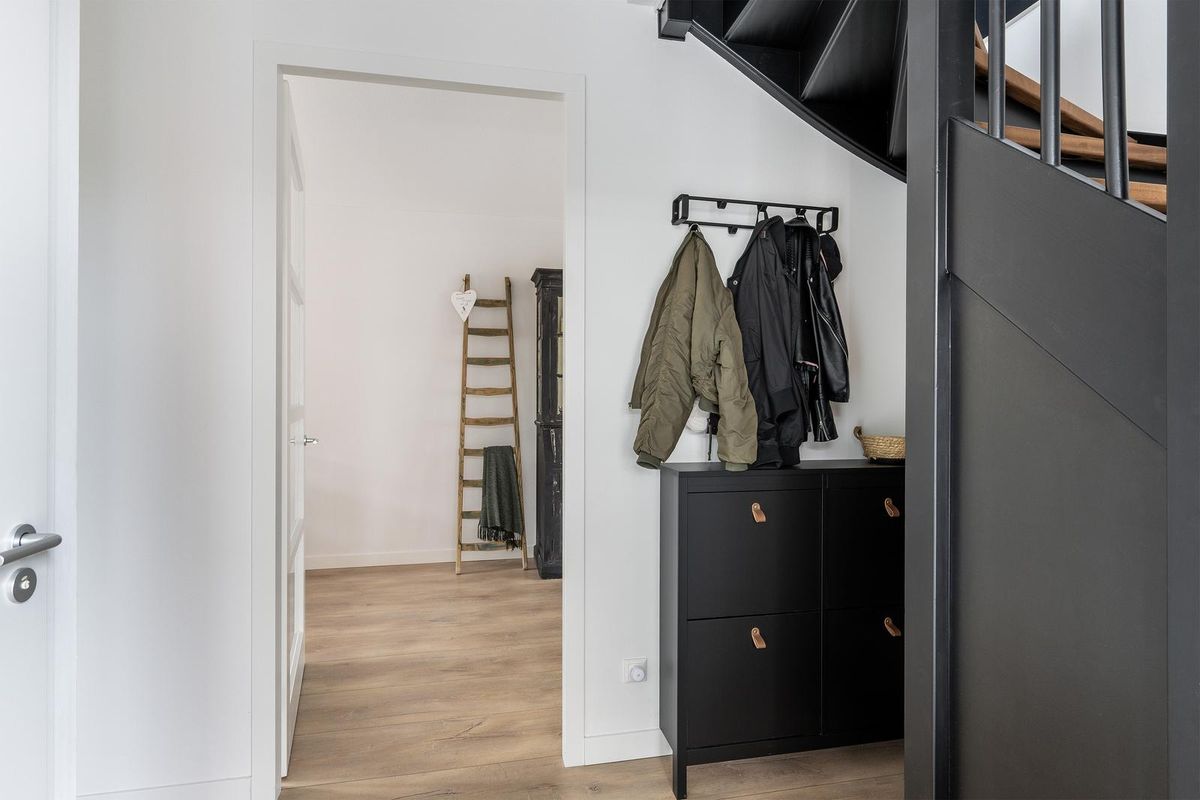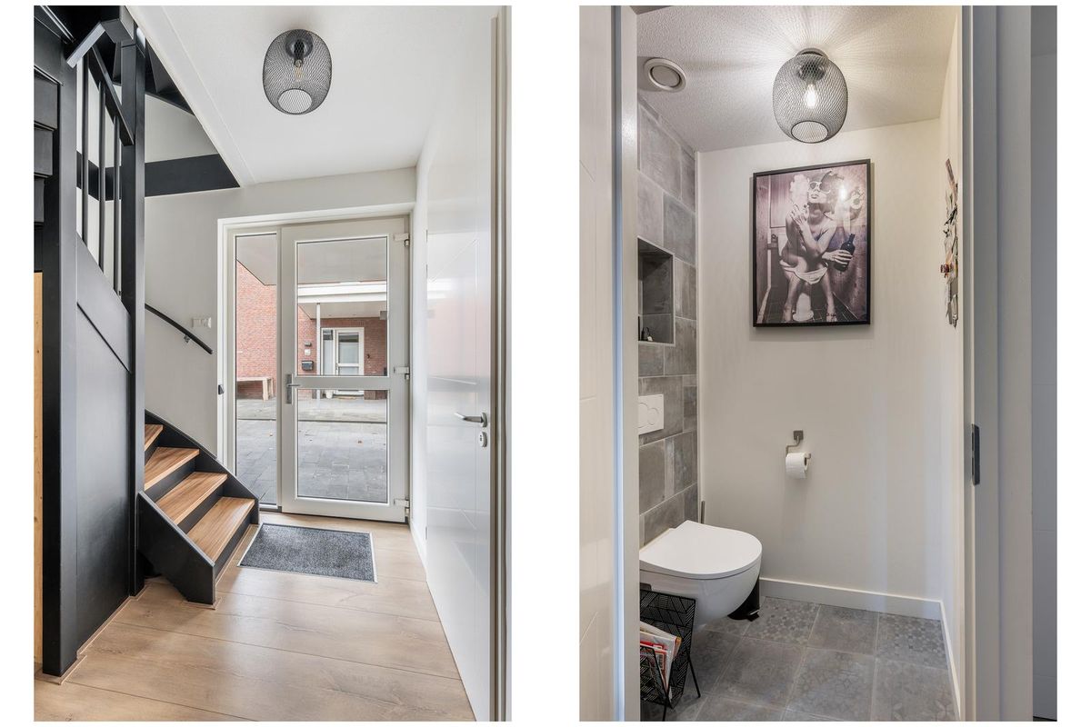 Hal/entree met de meterkast (12 groepen, laadpaalgroep, zonnepanelengroep, 3 aardlekschakelaars en glasvezelaansluiting), deels betegeld hangtoilet, trapopgang en toegang tot de woonkamer. De laminaatvloer - met vloerverwarming - is doorgelegd in de woonkamer, keuken en bijkeuken.