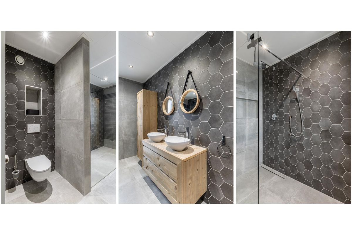 Moderne badkamer met een inloopdouche, wastafel met 2 waskommen, hangtoilet, designradiator, inbouwspots, mechanische ventilatie en vloerverwarming.