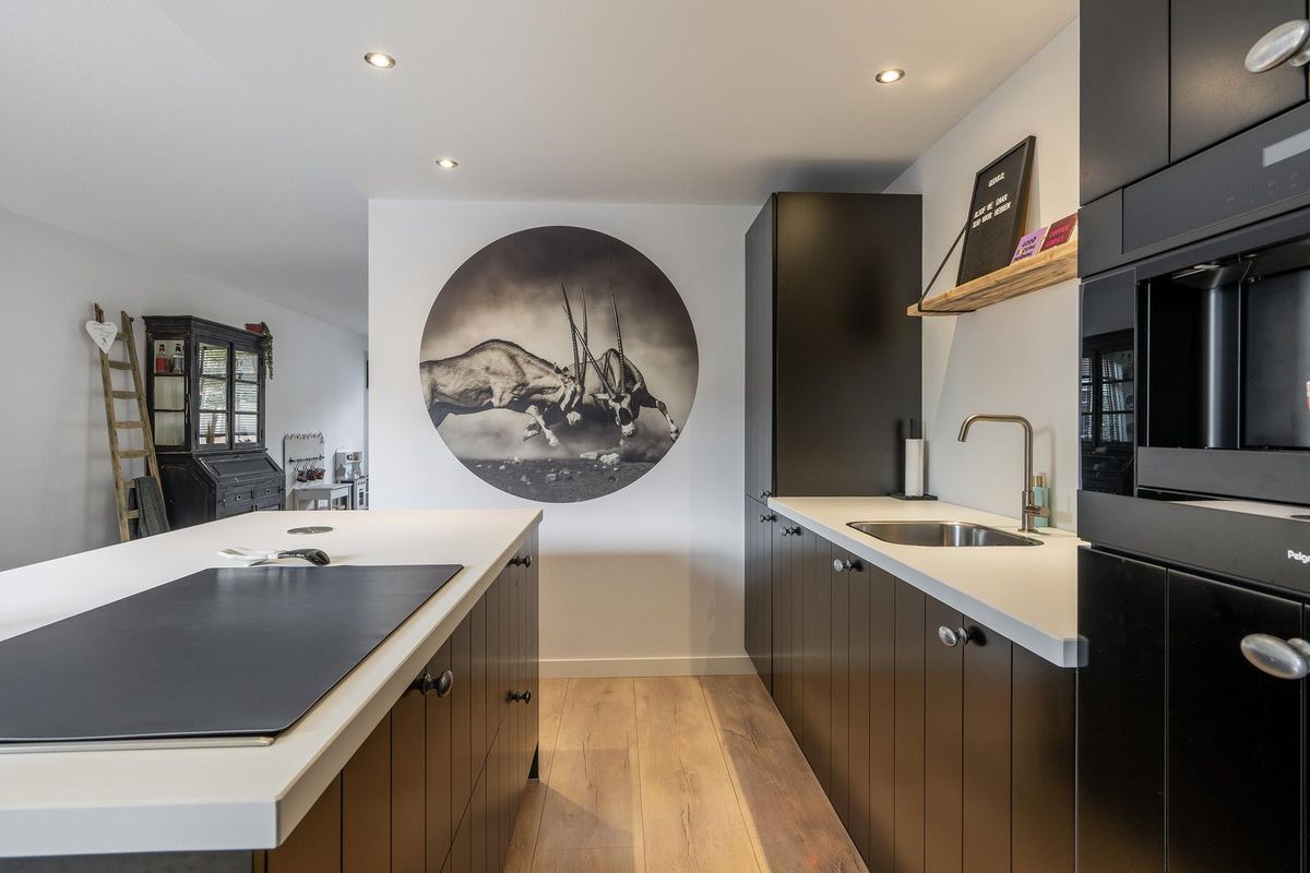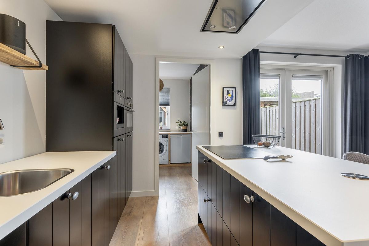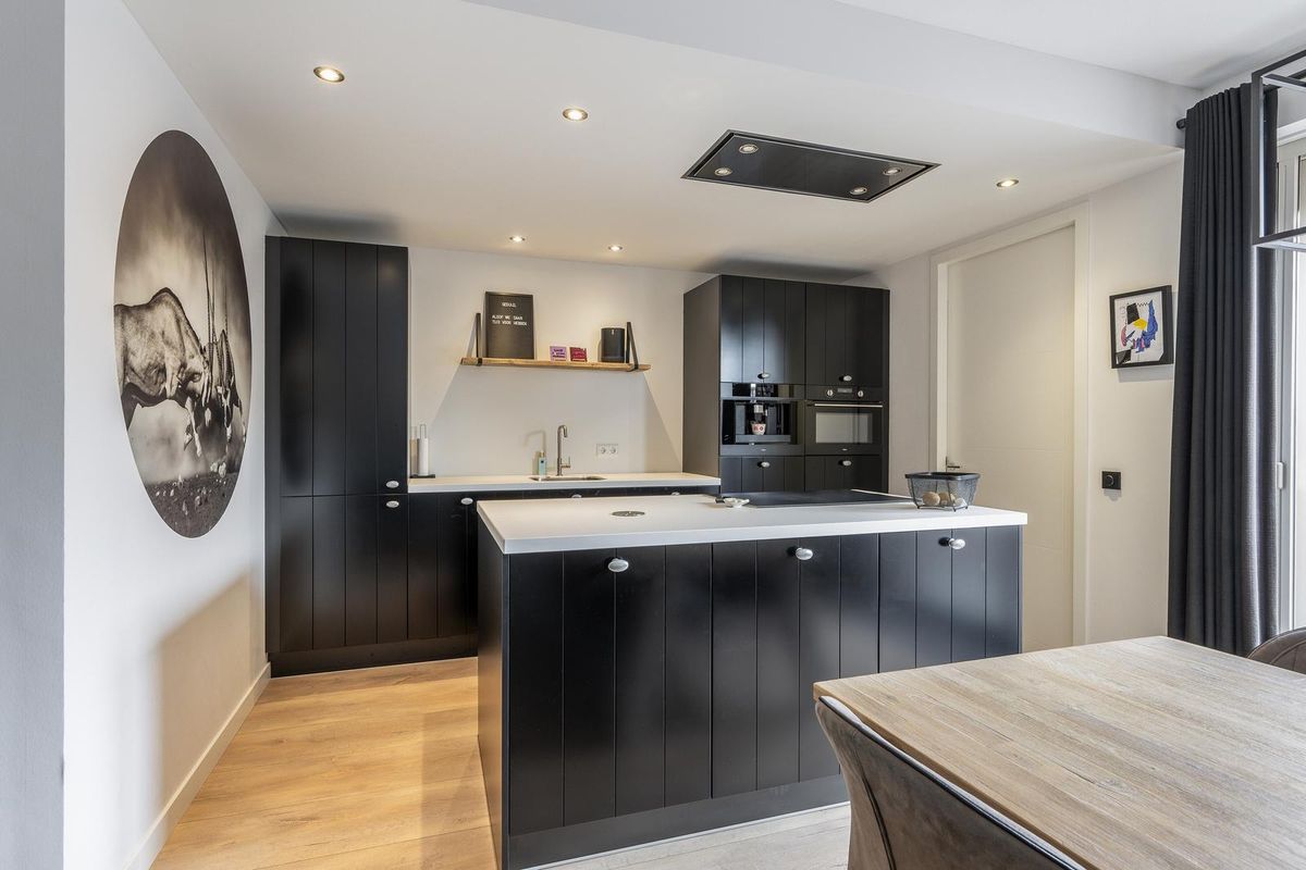 De keuken - met kookeiland - is in lengteopstelling geplaatst en voorzien van een 4-groeps inductiekookplaat, plafond inbouwkap, combi-ovenmagnetron, inbouwkoffiemachine, koel-vriescombinatie, vaatwasser en een composiet werkblad.