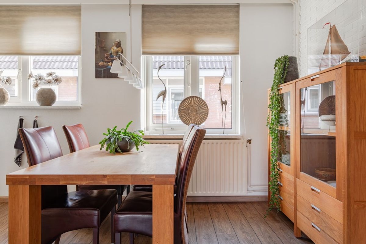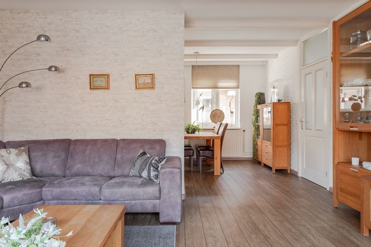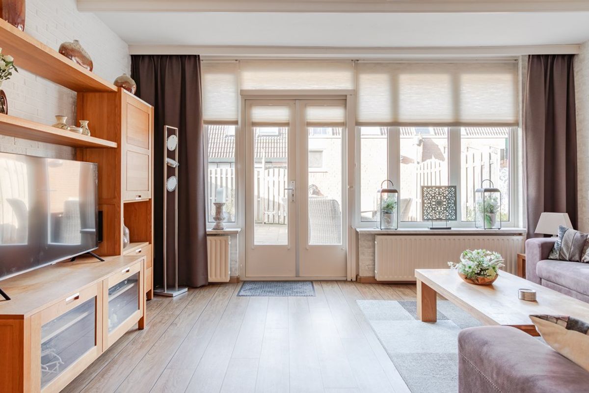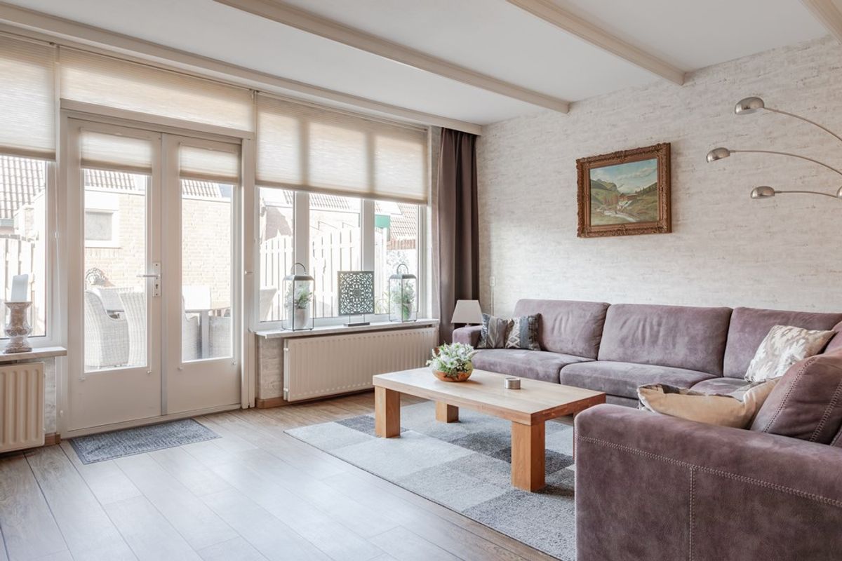 Fijne tuingerichte living met openslaande deuren en een plissé hor naar de zonnig gelegen tuin met een elektrisch te bedienen zonnescherm. De pvc-vloer is vanuit de hal doorgelegd, sierbalken tegen het plafond en 1 wand heeft steenstrips. Lekker veel lichtinval vanwege de grote raampartij met dubbel glas en boven de openslaande deuren kan een klapraam open. Radiatoren onder de brede vensterbanken verwarmen de zithoek.