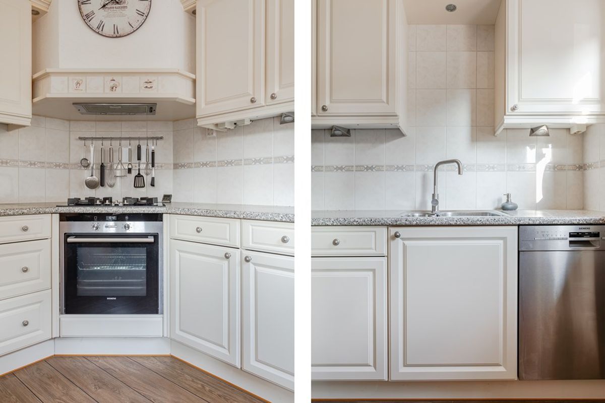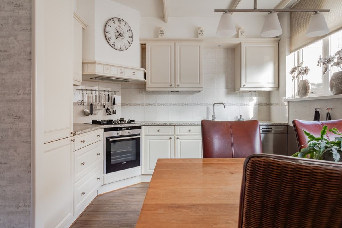 De keuken in lichte kleurstelling is in een hoek geplaatst met veel werkblad,