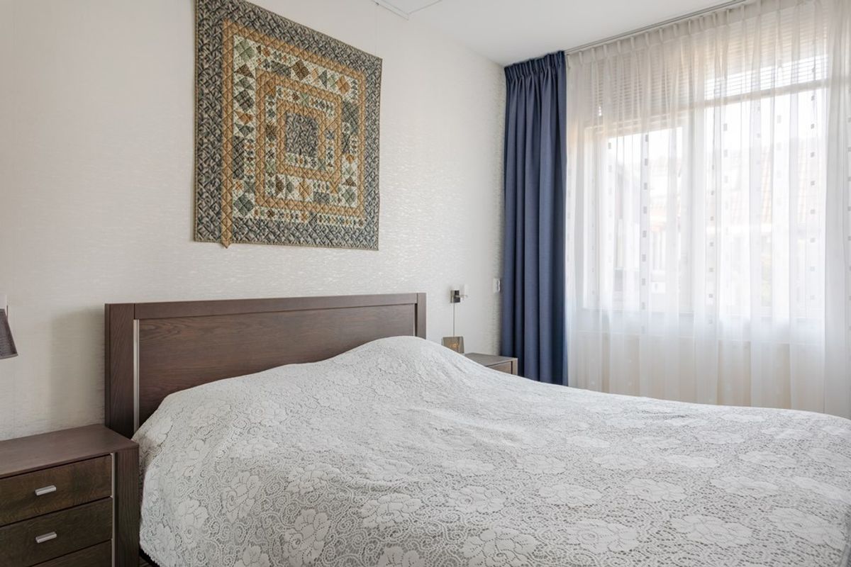 De slaapkamer op de begane grond heeft een laminaatvloer, de wanden zijn behangen en een vaste kastenwand met 4 schuifdeuren.