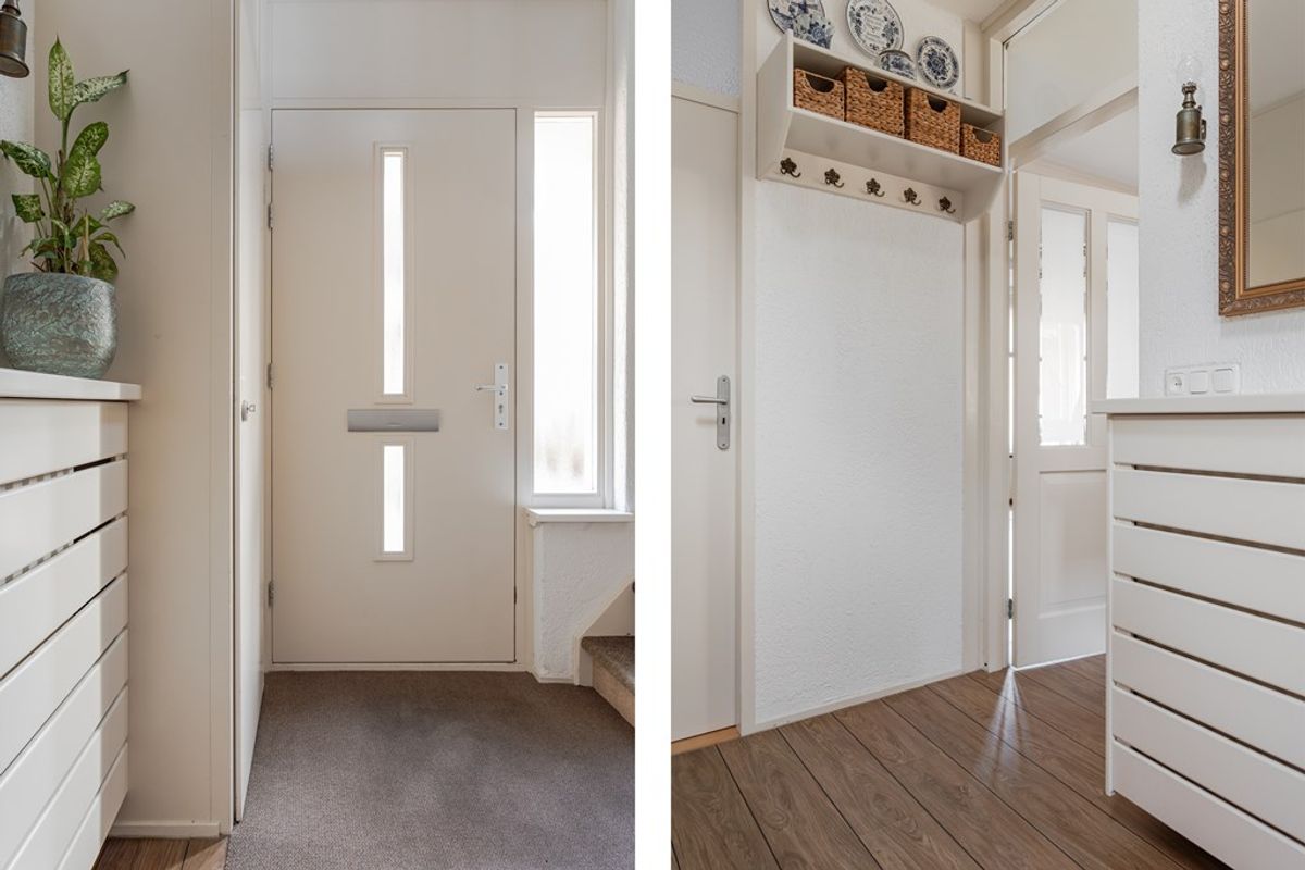 Geen voorbijrazend verkeer voor de deur want deze woning ligt in een autoloze straat. Naast de voordeur is een vaste plantenbak en achter de voordeur is een ruime hal met de trapopgang naar de vide.