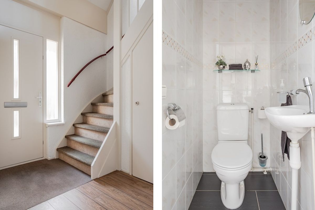 Op de vloer ligt een pvc-vloer die is doorgelegd in de living en keuken, de wanden zijn spachtelputz gestuukt en er is een ombouw om de radiator geplaatst. In de diepe trapkast met verlichting zit veel bergruimte en er is een ruim toilet met licht betegelde wanden, donkere vloer, staand toilet, fonteintje en een centraal afzuigsysteem. Een paneeldeur met melkglas en facet geslepen randen geeft toegang tot de living.