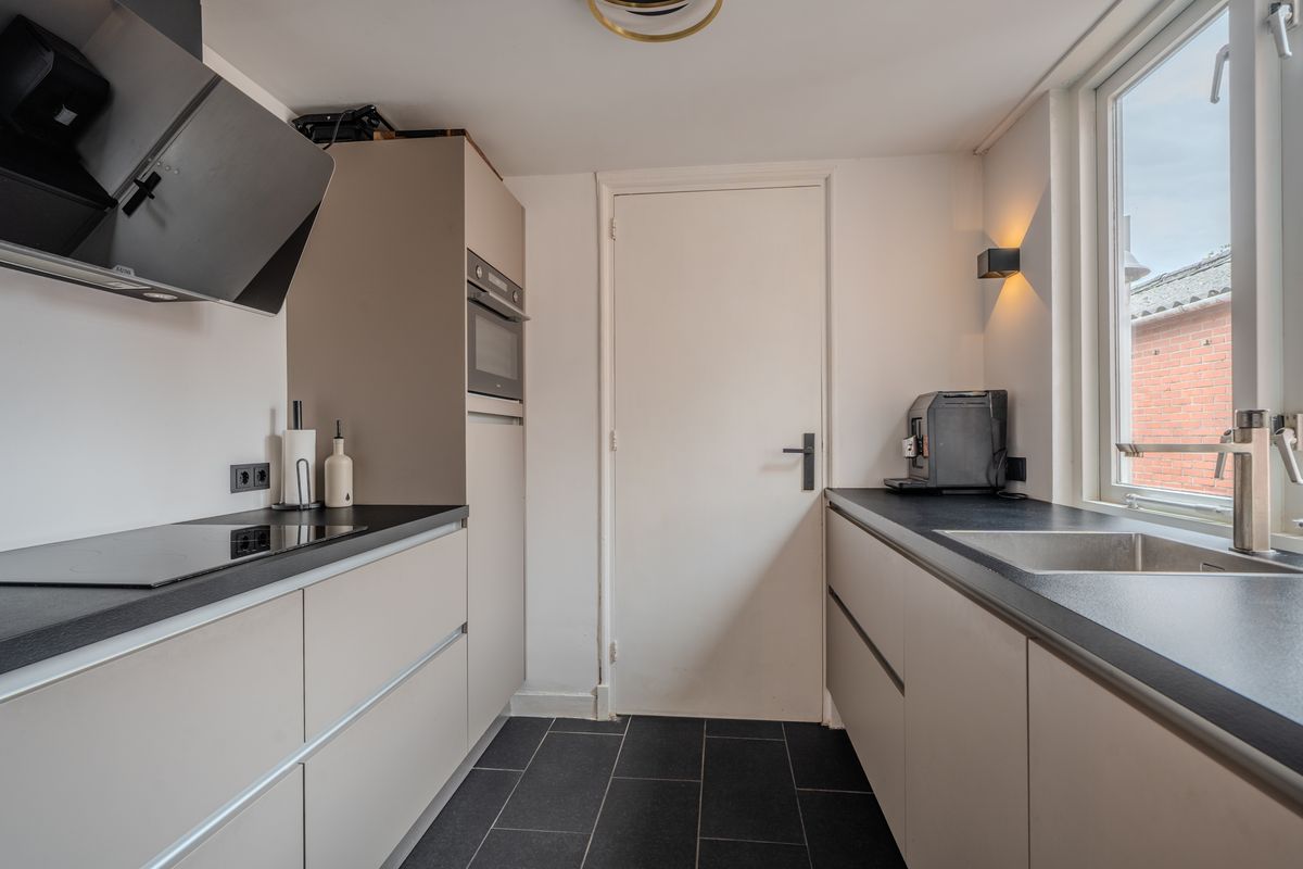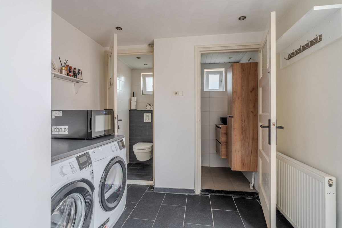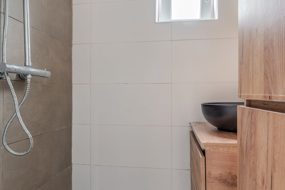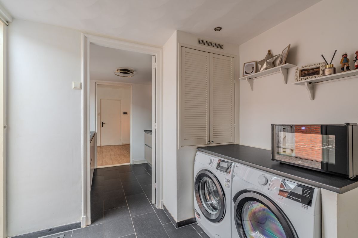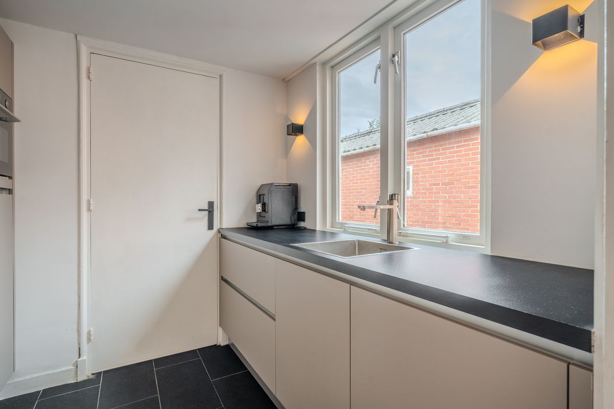 De moderne keuken is uitgerust met een inductiekookplaat, afzuigkap, combi-magnetron, koelkast en vaatwasser. Vanuit de keuken bereikt u de bijkeuken, waar de cv-ketel en witgoedaansluitingen zijn gesitueerd. Aansluitend bevinden zich een moderne toiletruimte en een nette badkamer met douche en wastafel met meubel.