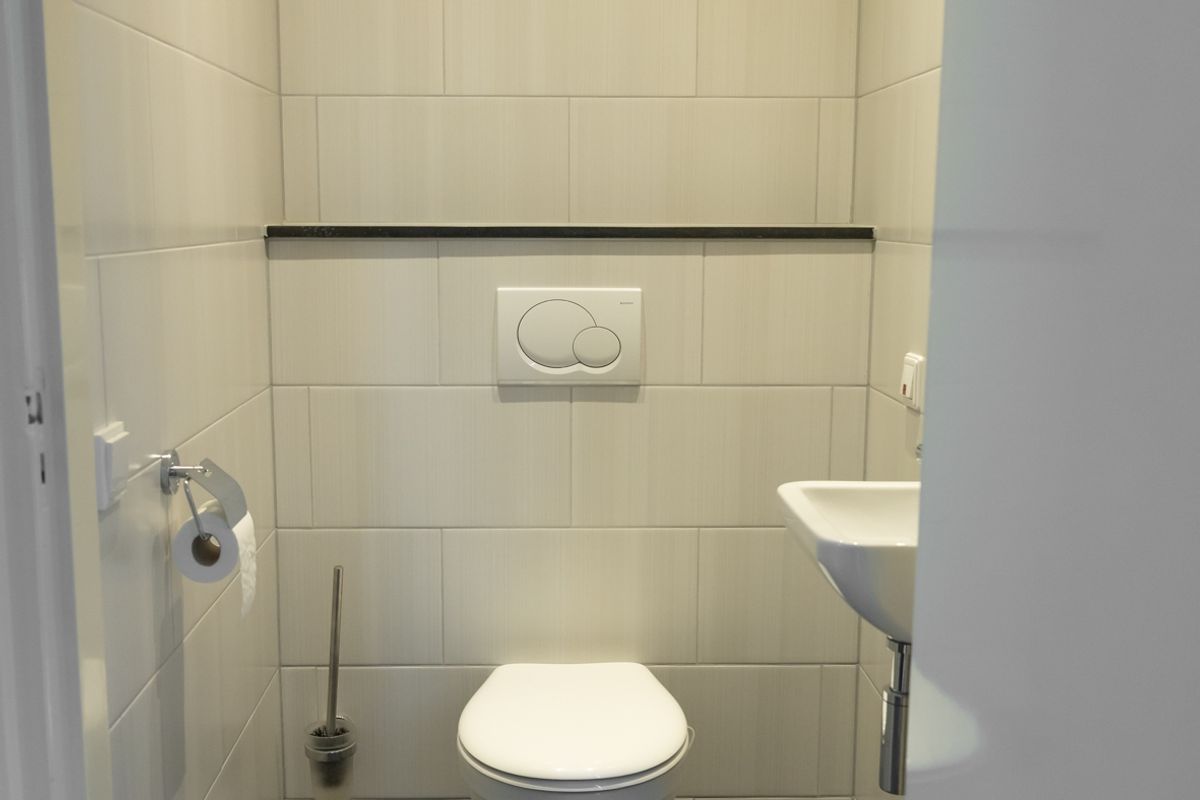 De badkamer is modern ingericht en beschikt over een ruime inloopdouche, zwevend toilet en een mooi badkamermeubel. Een deur in de badkamer geeft toegang tot het dak van de overkapping.