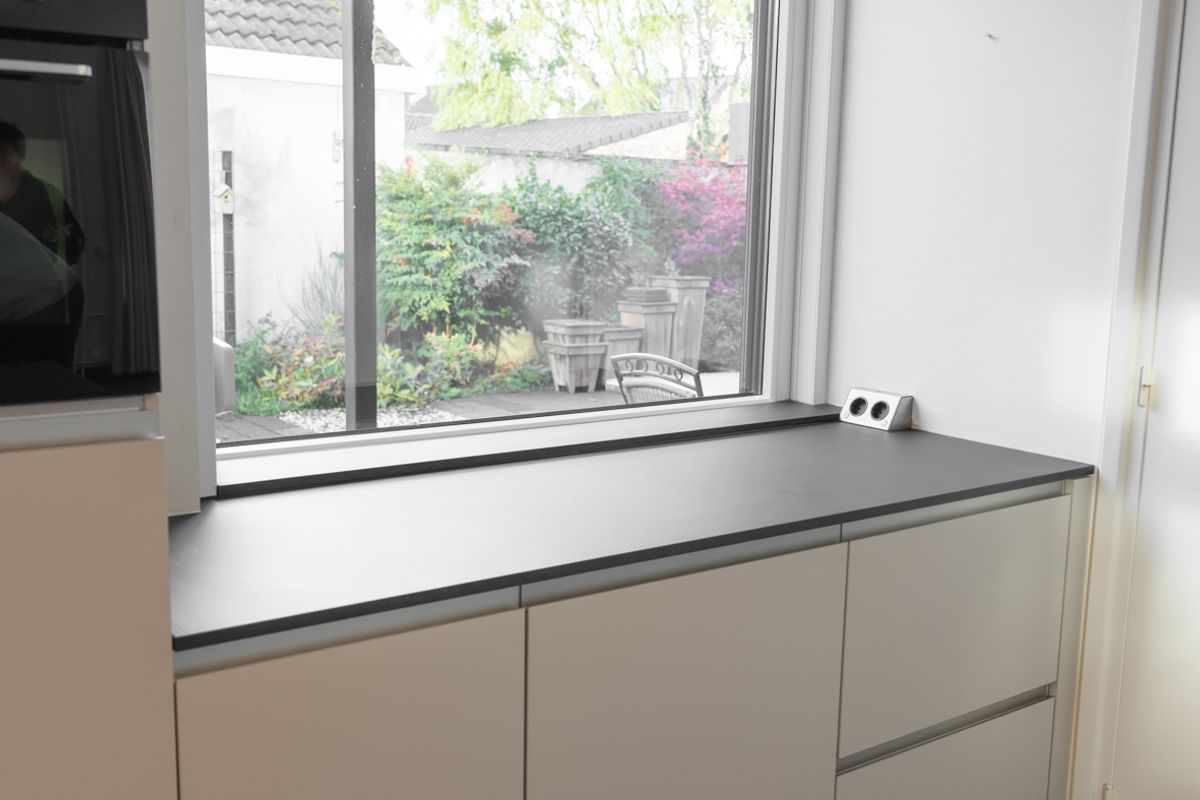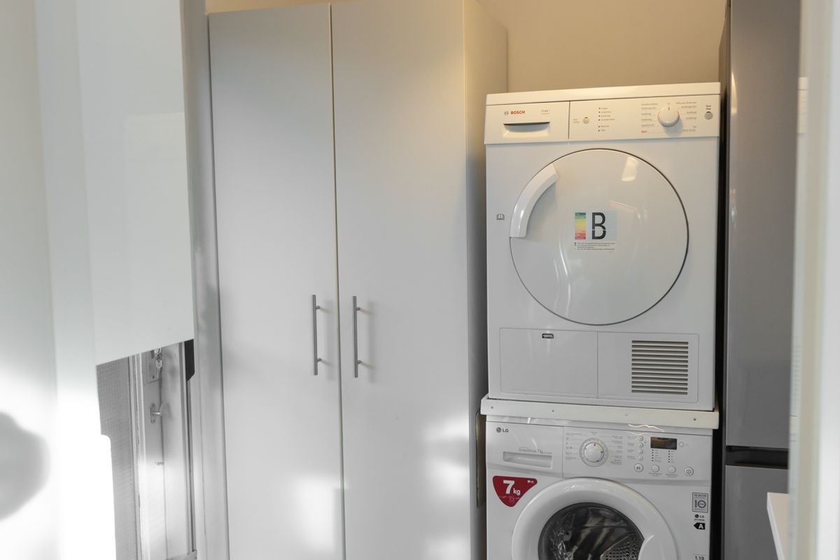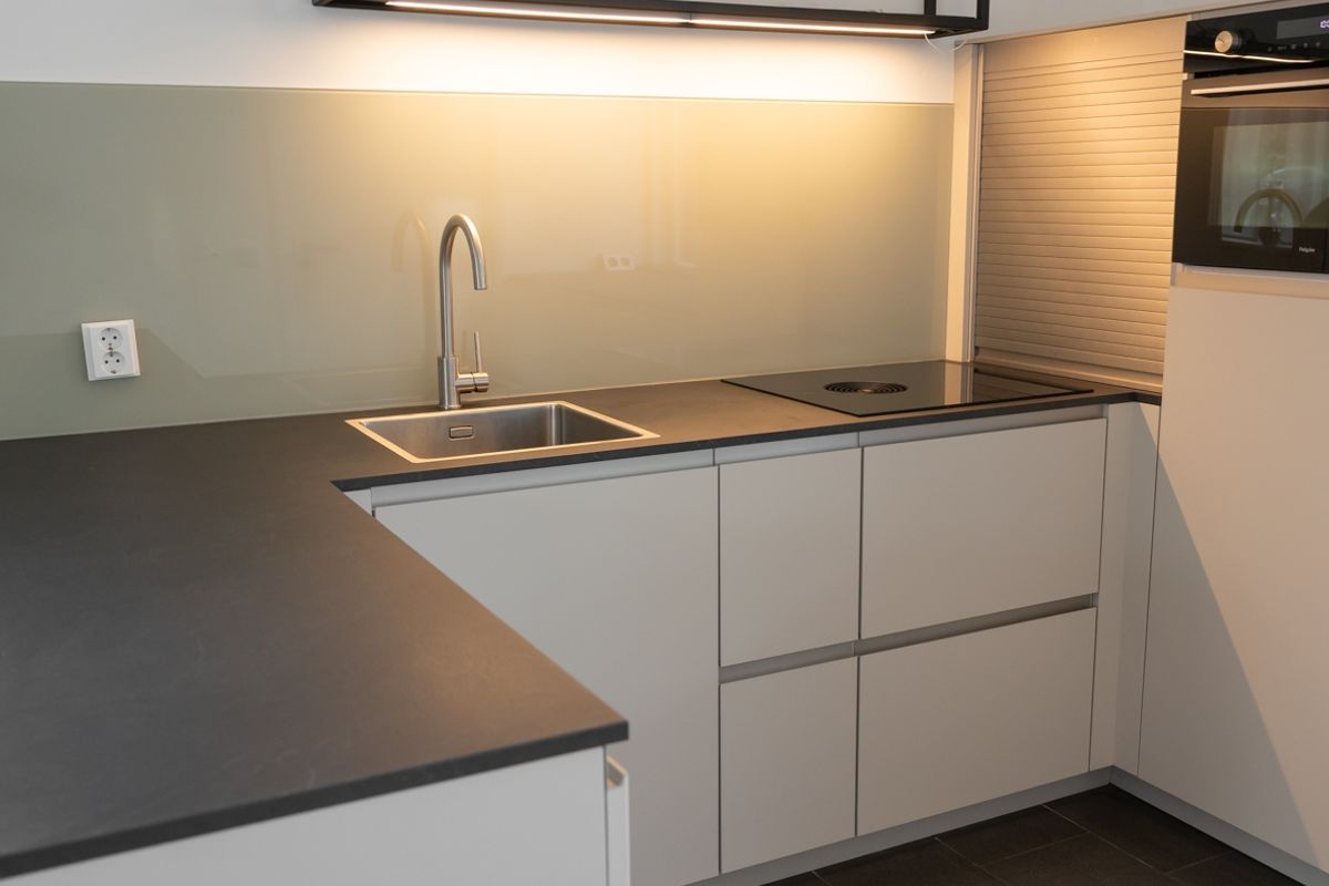 De open keuken is modern uitgevoerd en uitgerust met een inductiekookplaat, Bora-afzuiging, koelkast, vaatwasser en combi-oven. Aangrenzend ligt de praktische bijkeuken met aansluitingen voor was en droger.