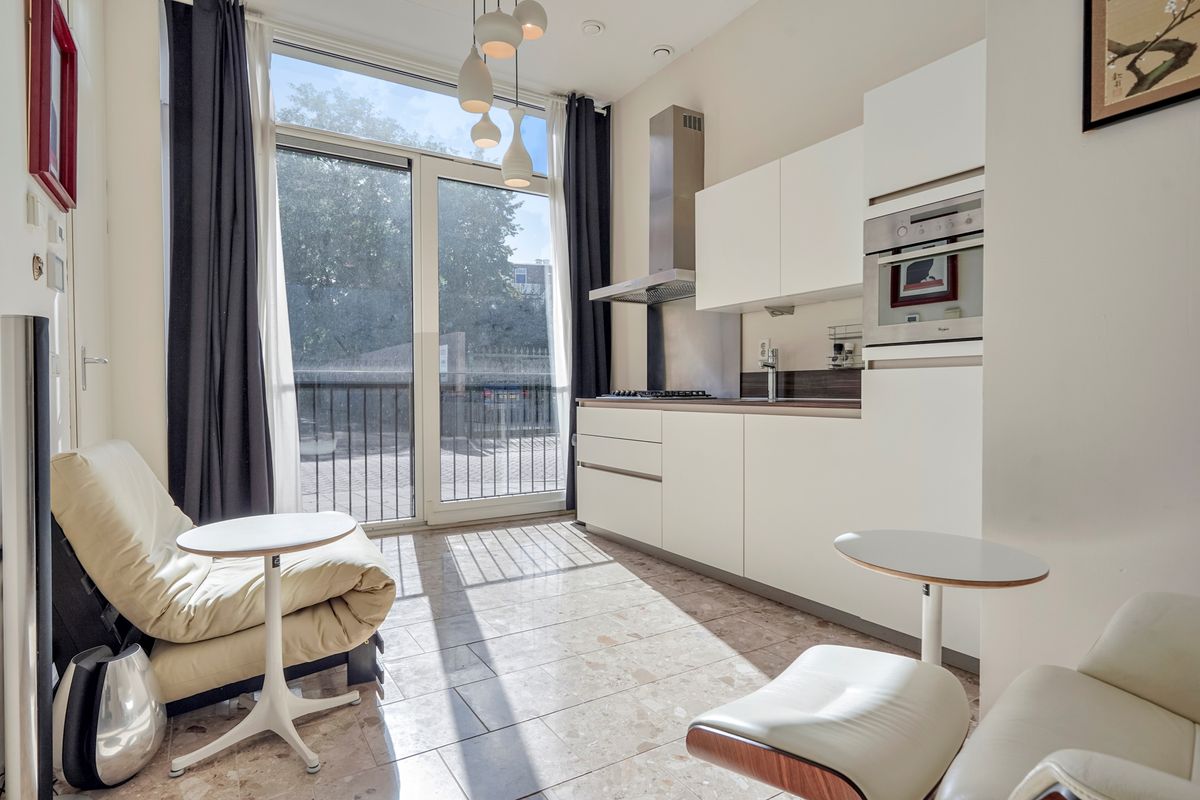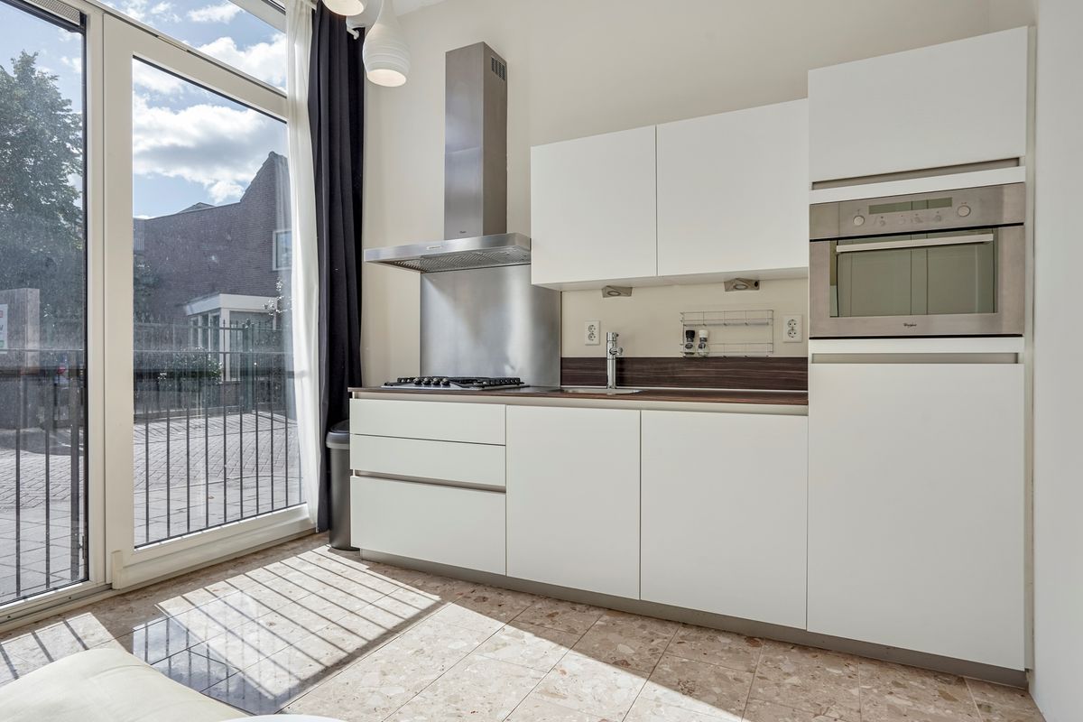 De open keuken is aan de voorzijde gesitueerd. De rechte opstelling is zeer compleet uitgevoerd en voorzien van een vaatwasser, combi-oven, gaskookplaat met vier pitten, brede rvs-afzuigkap en een koelkast met vriesvak. De fronten zijn wit van kleur, wat fraai combineert met het wenge kleurige werkblad en de vloer. Aan de voorzijde biedt een grote raampartij/schuifpui uitzicht op de stadse woonomgeving.