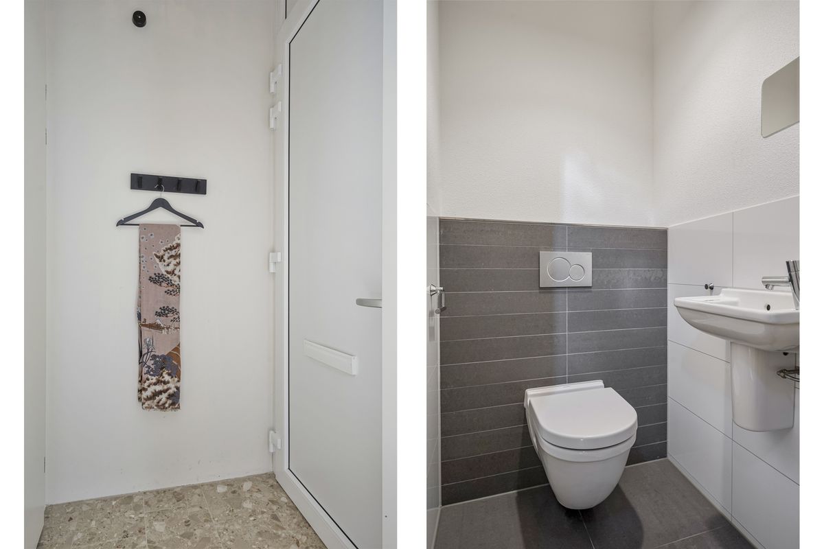De toegang tot de woning bevindt zich aan de Kloosterstraat, je hoeft dus geen gebruik te maken van de centrale toegangspoort van het complex. Je komt de studio binnen in de hal. Hier bevindt zich de toiletruimte. Deze is afgewerkt in een combinatie van grote witte en antraciet tegels. De ruimte is uitgerust met een wandcloset en een fonteintje. Je kunt ook gebruikmaken van de achterdeur om de woning te betreden, als dat je voorkeur heeft.