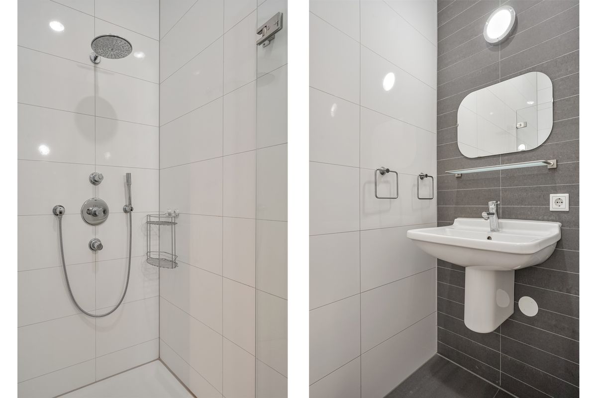 De douchehoek is voorzien van een regendouche en ingebouwde thermostaatkraan. De betegeling is uitgevoerd met dezelfde tegels als de toiletruimte: wit en mat antraciet.