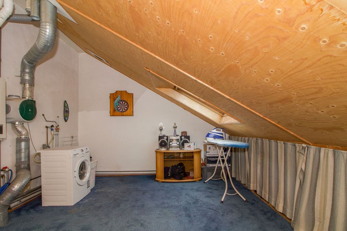 Via een vaste trap bereikt u de zolderverdieping. Deze open ruimte is voorzien van aansluitingen voor wasapparatuur en biedt volop mogelijkheden voor het creëren van een extra slaapkamer, werkruimte of berging.