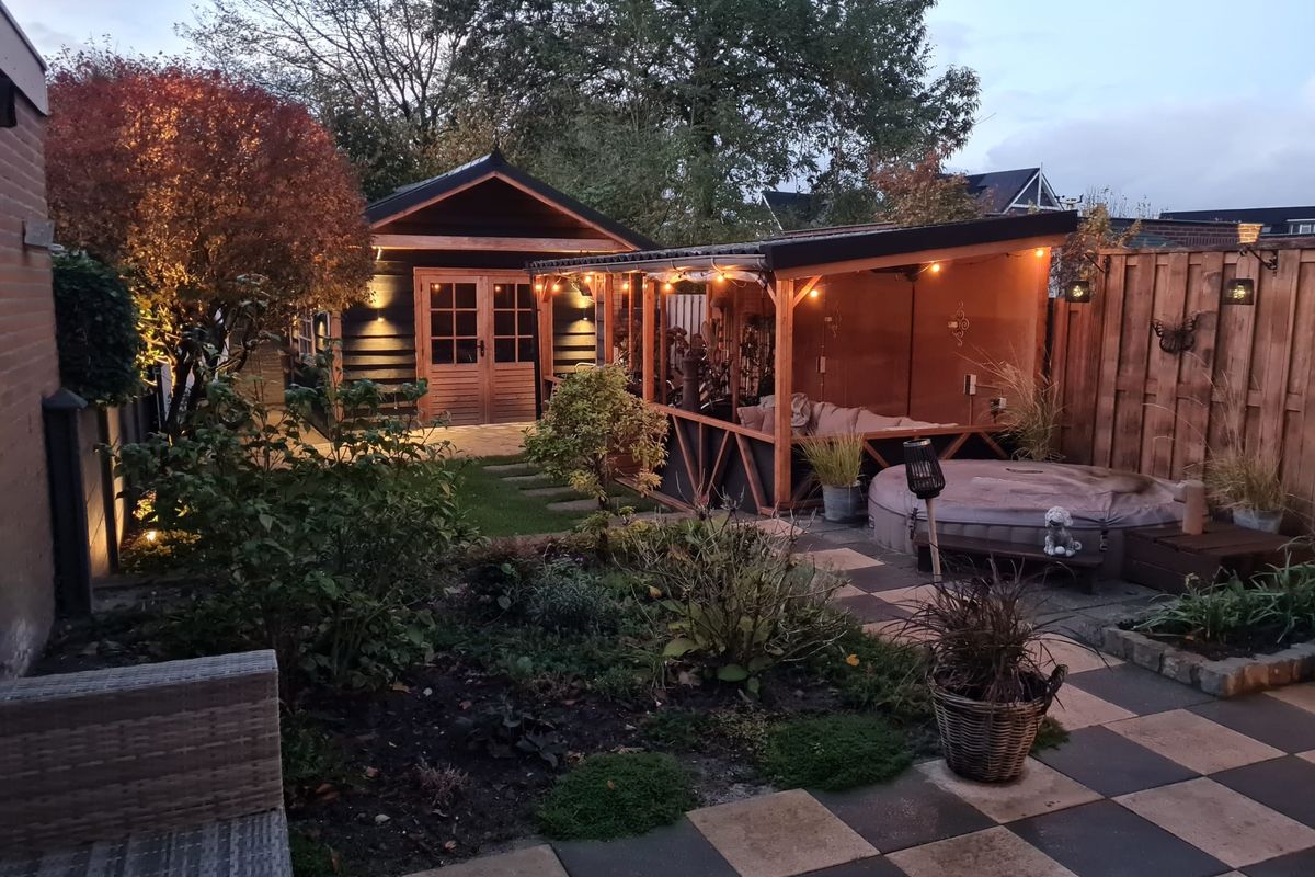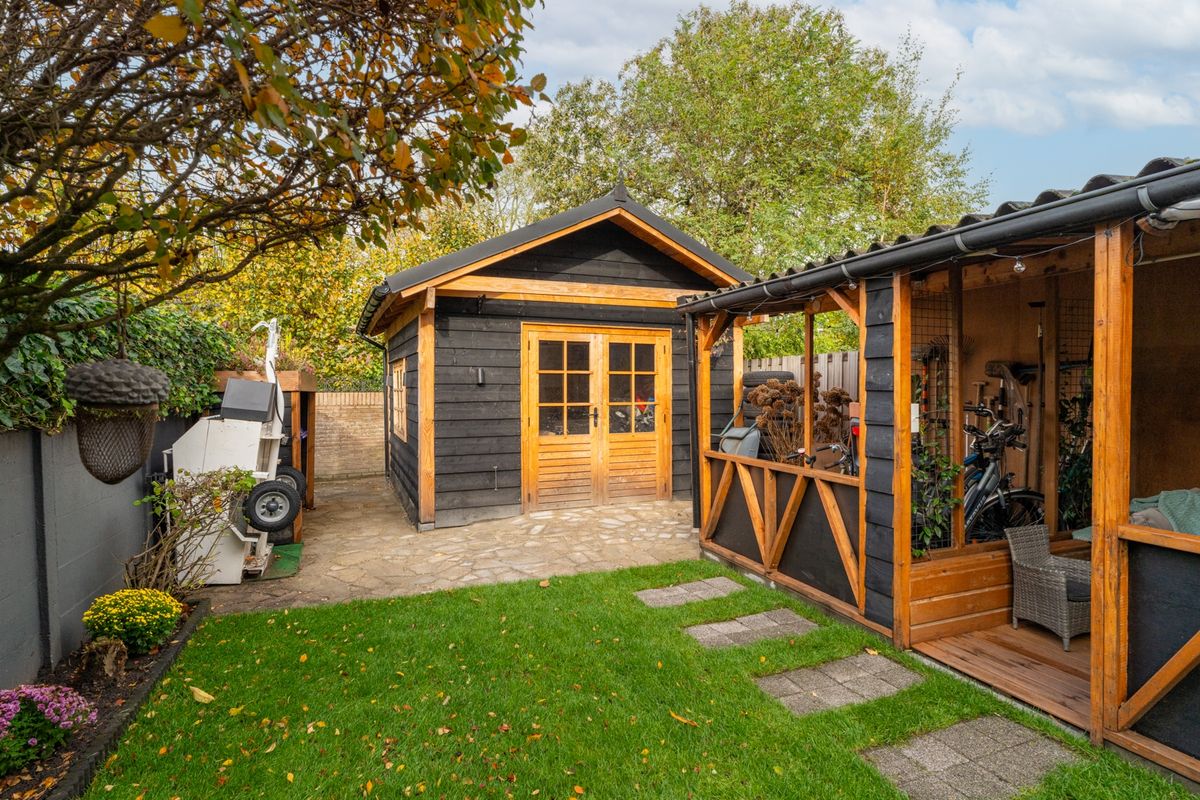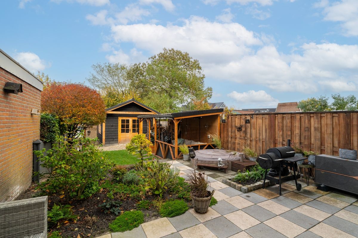 In de tuin vind je een grote schuur met volop bergruimte én een heerlijke overkapping, ingebouwde jacuzzi perfect om lange avonden buiten te zitten of te genieten van het voor- en najaar. Daarnaast beschikt de tuin over een achterom, zonnescherm en buitenkraan – een ideale plek voor liefhebbers van buitenleven.