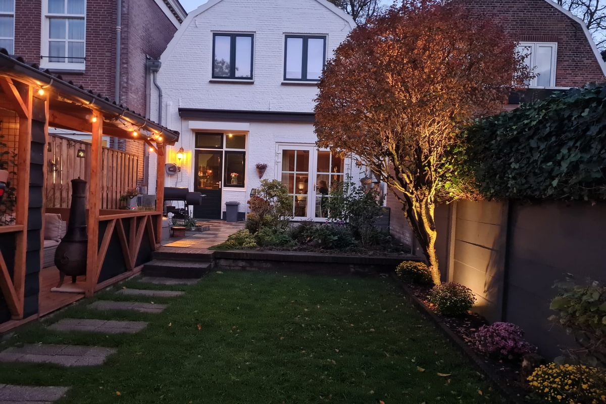 De verzorgde achtertuin ligt op het noordwesten en grenst direct aan een park. Hierdoor geniet je van rust, privacy en een prachtig uitzicht op het groen.