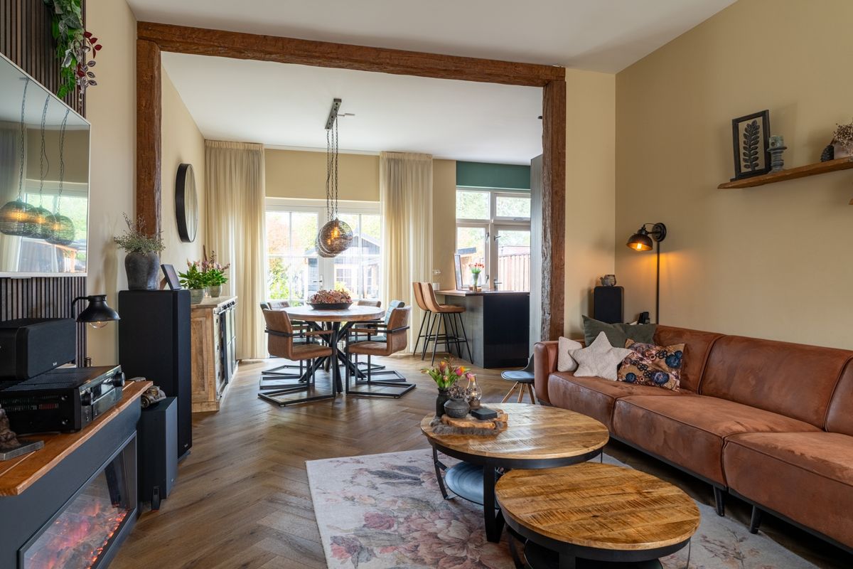 De woonkamer is licht en uitnodigend, met een sfeervolle haard als middelpunt — dé plek voor gezellige avonden.