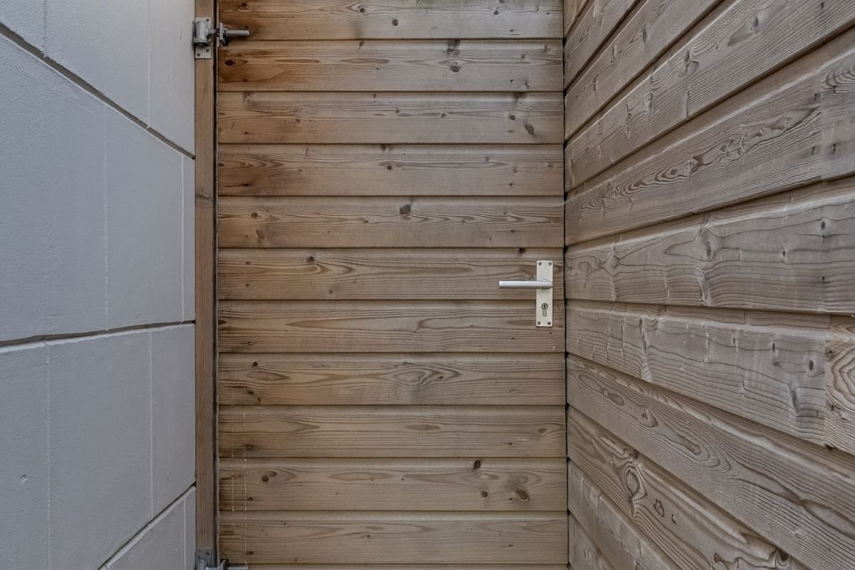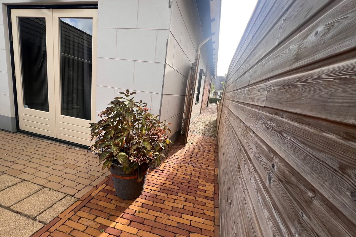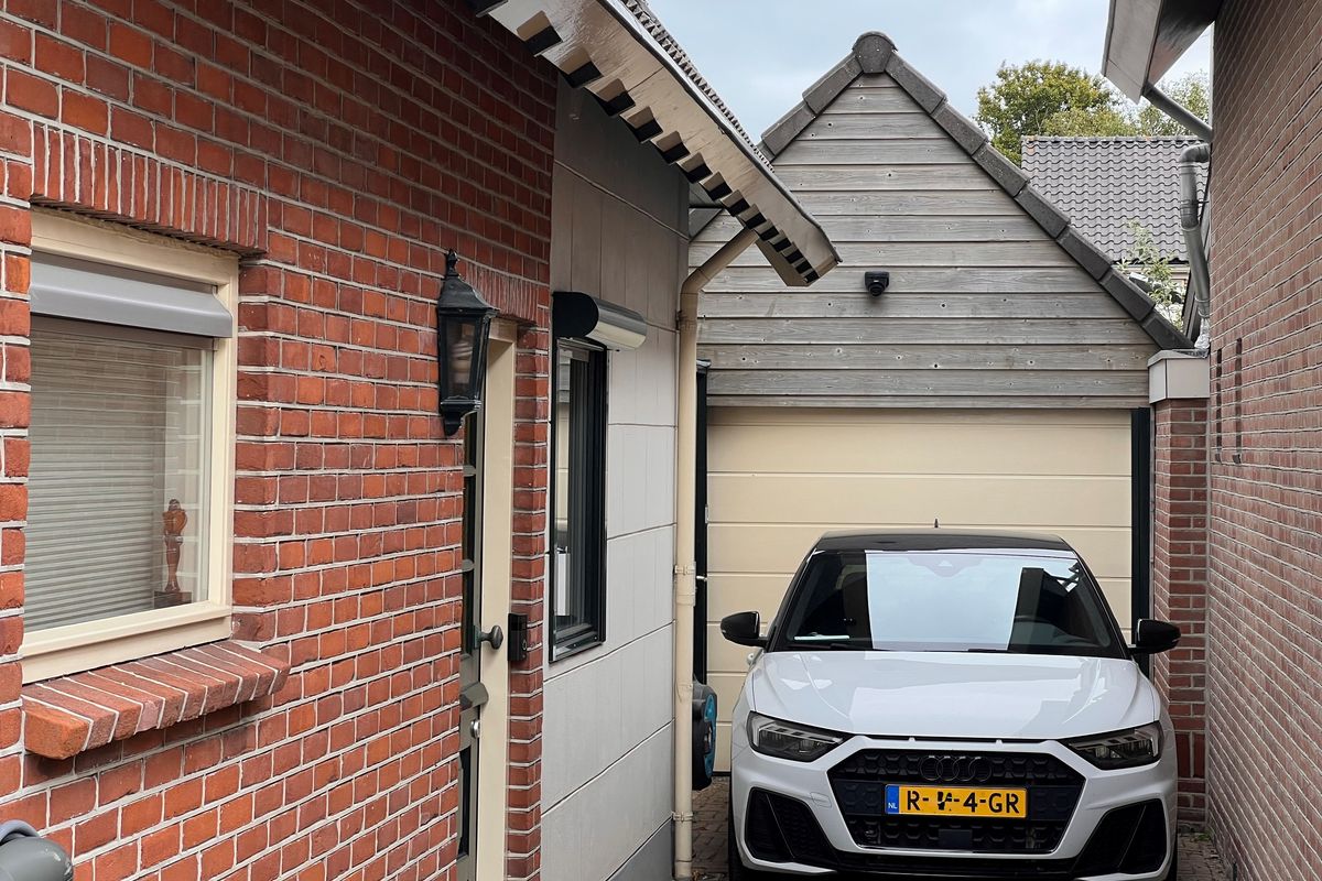 De garage/berging met aansluitende overkapping is circa anderhalve meter gelegen achter de achtergevel. Er is tussen de garage en de woning een poort geplaatst, welke vanaf de oprit leidt naar de achterdeur en terras.