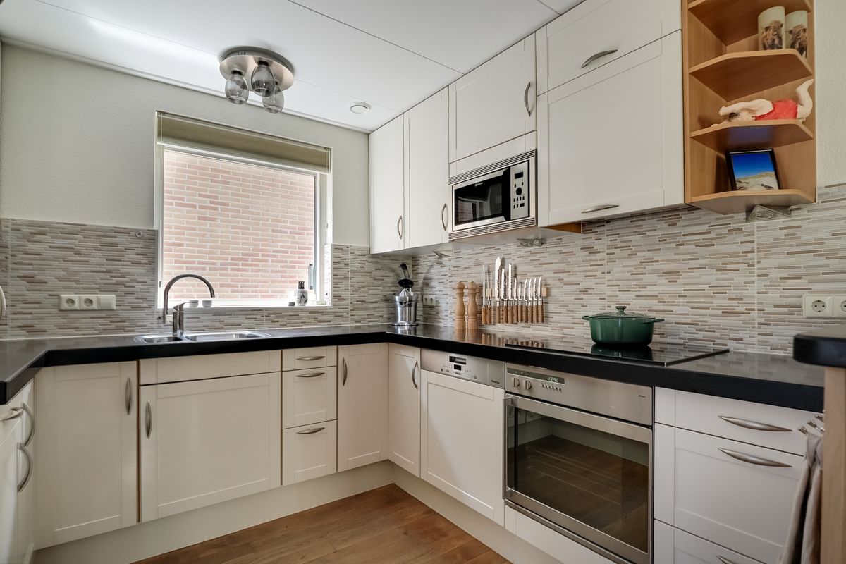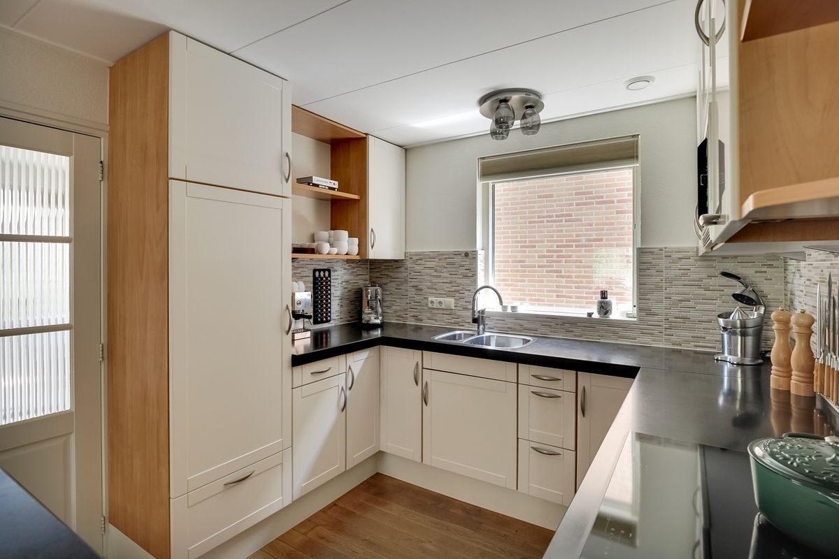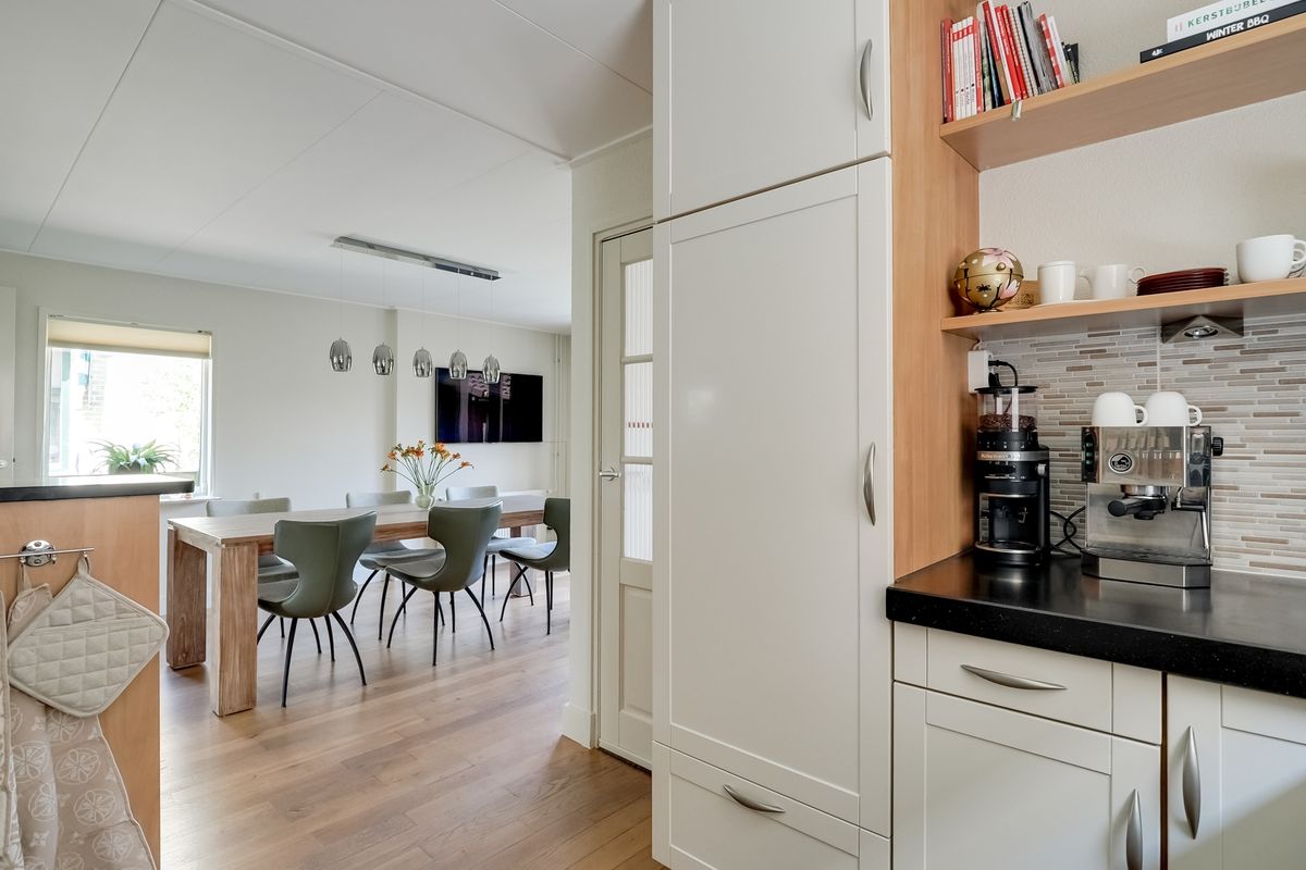 De open keuken heeft een U-vormige opstelling zodat u bijna niet mis kunt tasten bij het kokkerellen. Ook in keukenapparatuur is het rijk voorzien, ik noem er enkele; inductie kookplaat, afzuigkap, magnetron, oven, vaatwasser en koelkast. Verder ruim voldoende kastruimten en 2 carrousel kasten. Het natuurstenen keukenblad maakt het geheel compleet. Vanuit de open keuken heeft u zicht op de zeer ruime eetkamer.