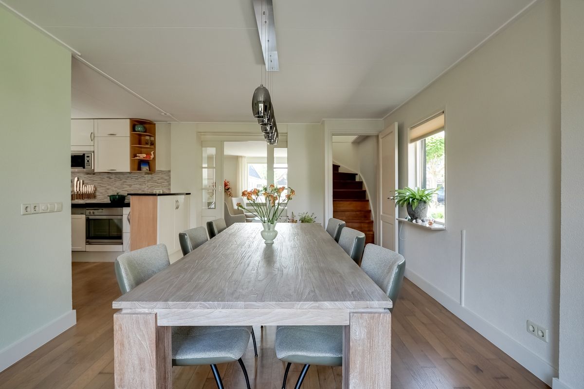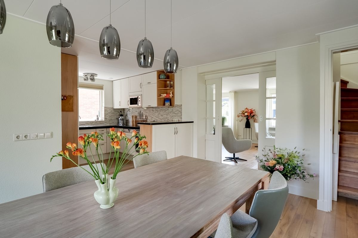 Vanuit de flinke eetkamer (circa 6 x 3.3= 20 m2) heeft u zowel zicht op de dubbel openslaande deuren naar het terras, de tuin, de keuken, maar ook op de slim geplaatste scheidingswand voorzien van inbouwkasten met paneeldeuren en ensuite schuifdeuren met glaspanelen, welke toegang geven tot de woonkamer.