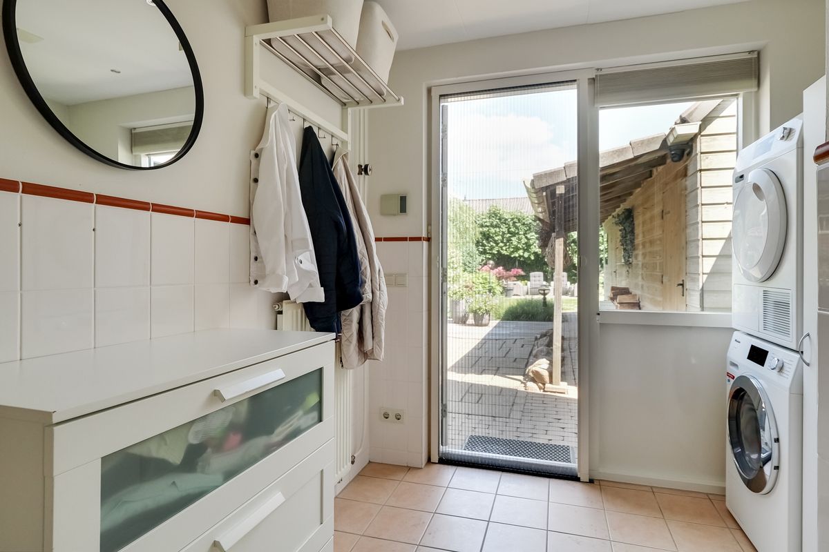 We stappen echter eerst de woning binnen via de bijkeuken. Hier treft u een praktische opstelling van wasmachine, wasdroger en vervolgens de wc-ruimte met aansluitend de toegang naar de keuken.