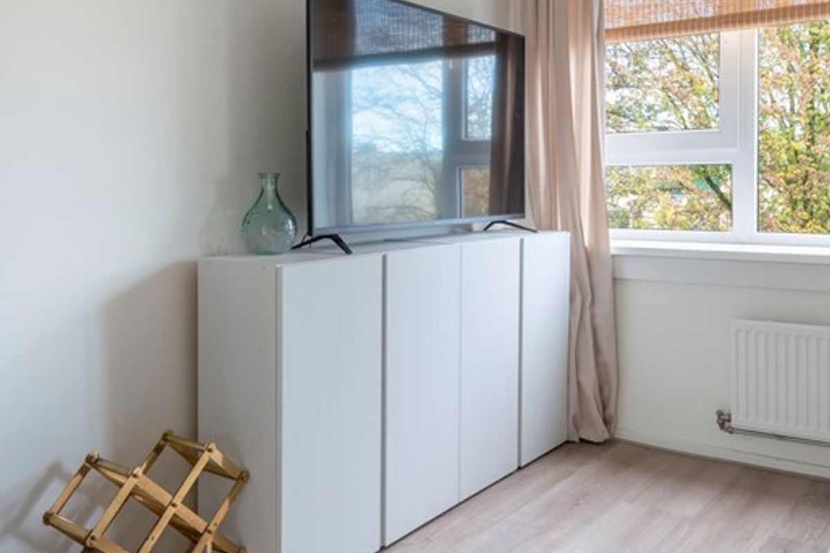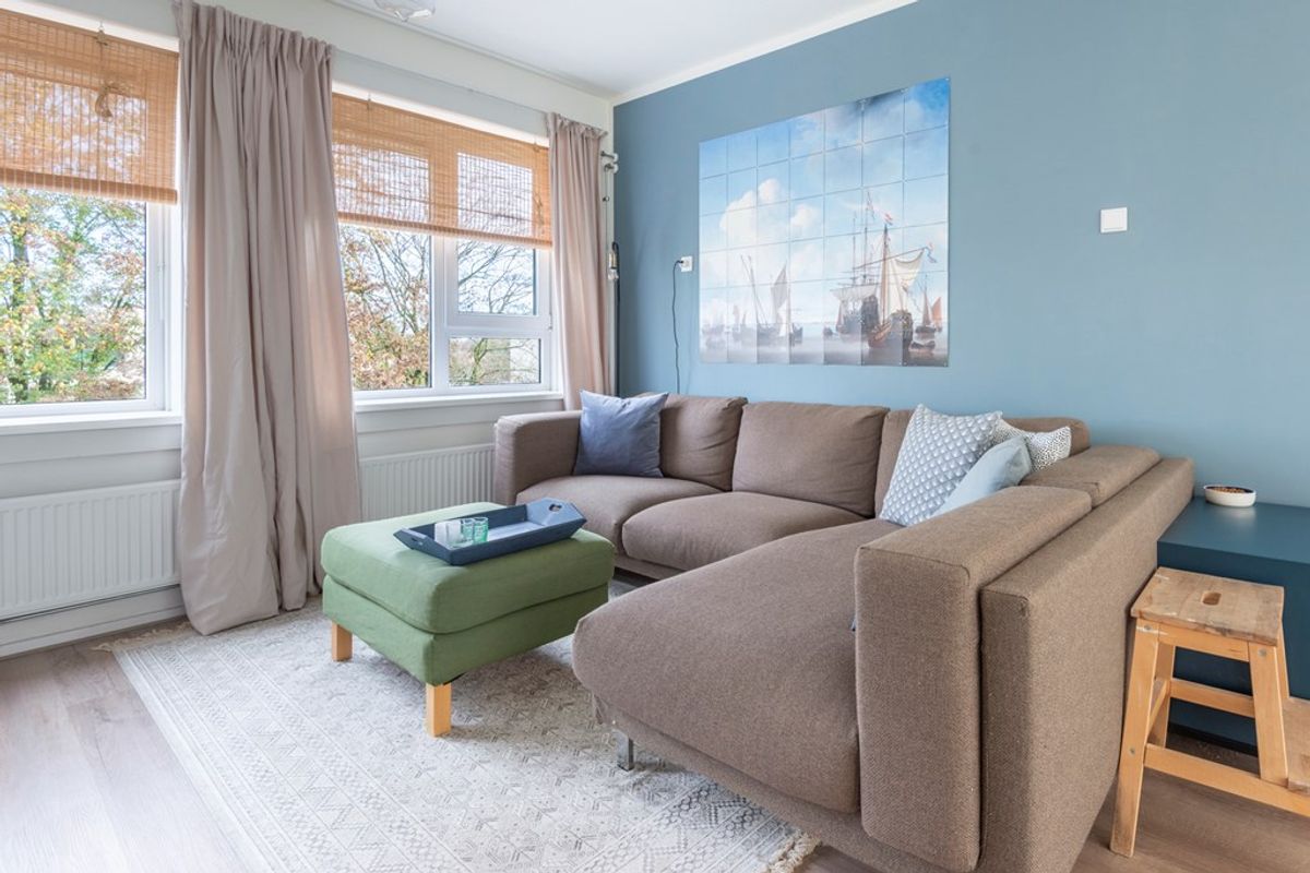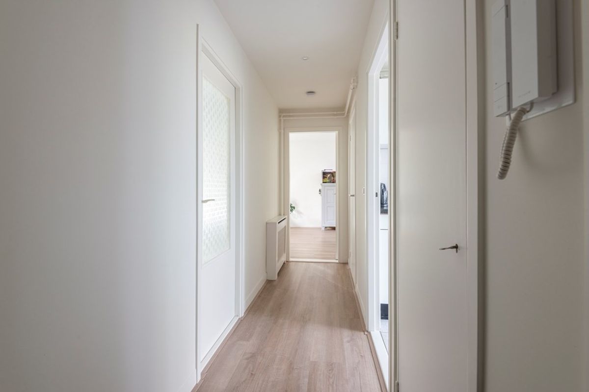Het appartement is praktisch ingedeeld: entree met een nette glad gestuukte centrale hal met intercominstallatie, toilet en meterkast. Vanuit de hal toegang tot de ruime, lichte woonkamer met een neutrale goede laminaatvloer, glad gestuukte wanden, kunststof kozijnen met dubbel glas en zowel aan de voor- als aan de achterzijde openslaande ramen. Het schoorsteenkanaal is nog aanwezig, een open haard / allesbrander kan desgewenst geïnstalleerd worden. De oorspronkelijke deur naar het balkon is nu een vast raam geworden maar hier kan relatief eenvoudig weer een deur geplaatst worden. Vanuit de woonkamer is er een prachtig vrij uitzicht over de groenvoorziening en de volkstuintjes gelegen aan de achterzijde.