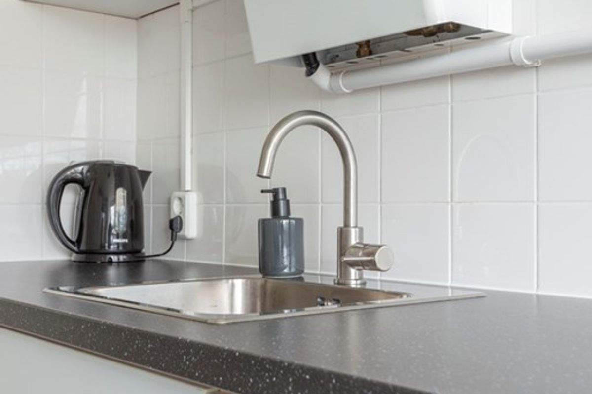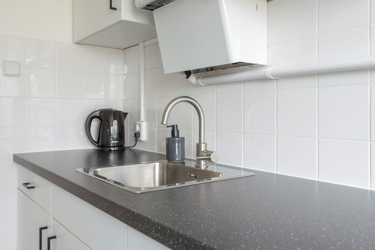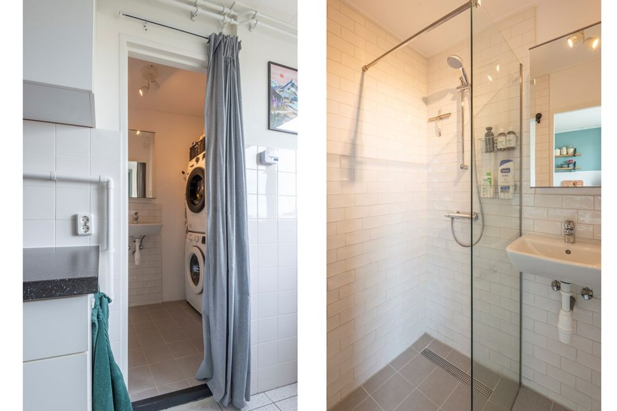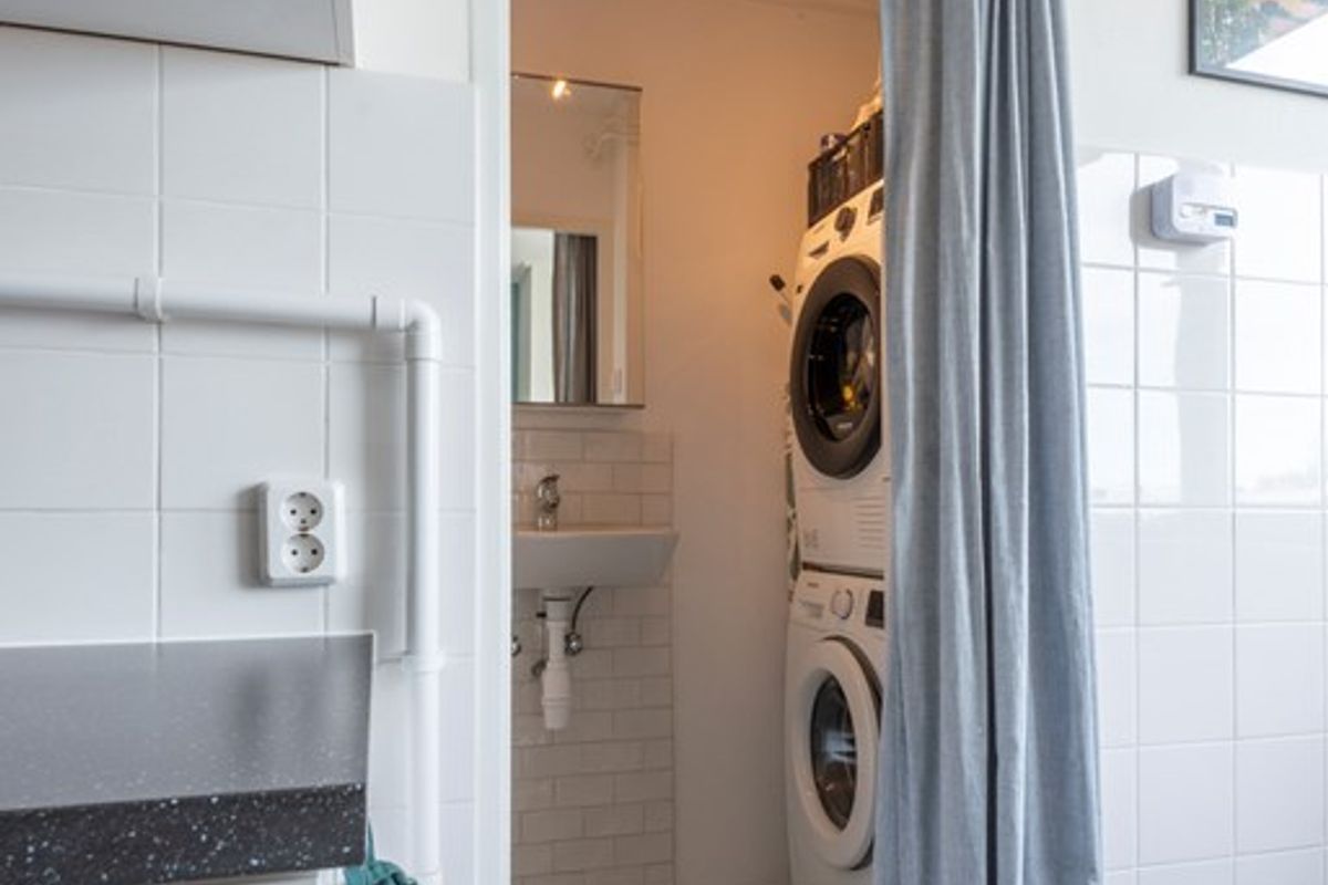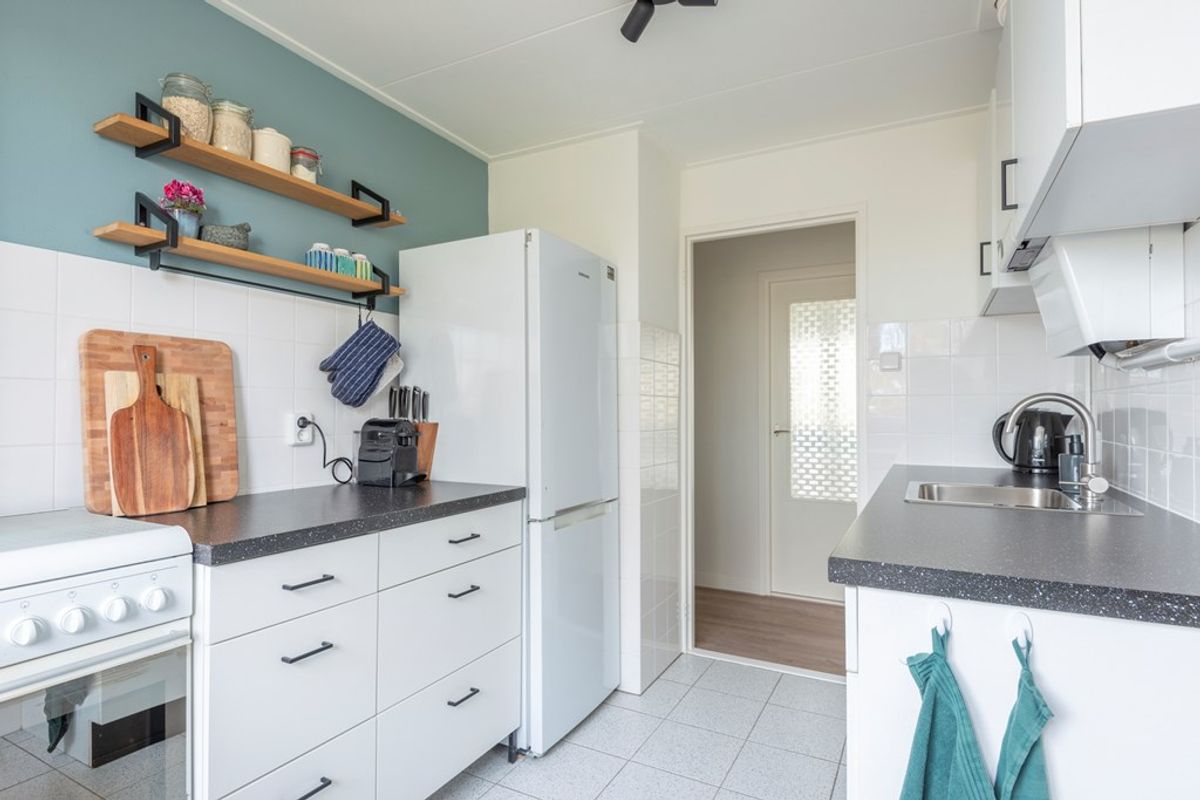 De keuken is uitermate netjes onderhouden en is langs beide wanden geplaatst, o.a. voorzien van een losse koel-vriescombinatie en een los gasfornuis. Hier is ook de opstelplaats voor de C.V.-ketel welke netjes in het “geheel” opgaat. In de keuken is de doorloop naar de 5 jaar geleden vernieuwde badkamer met een inloopdouche en wastafel. In de badkamer is tevens de aansluiting voor de wasmachine en wasdroger.