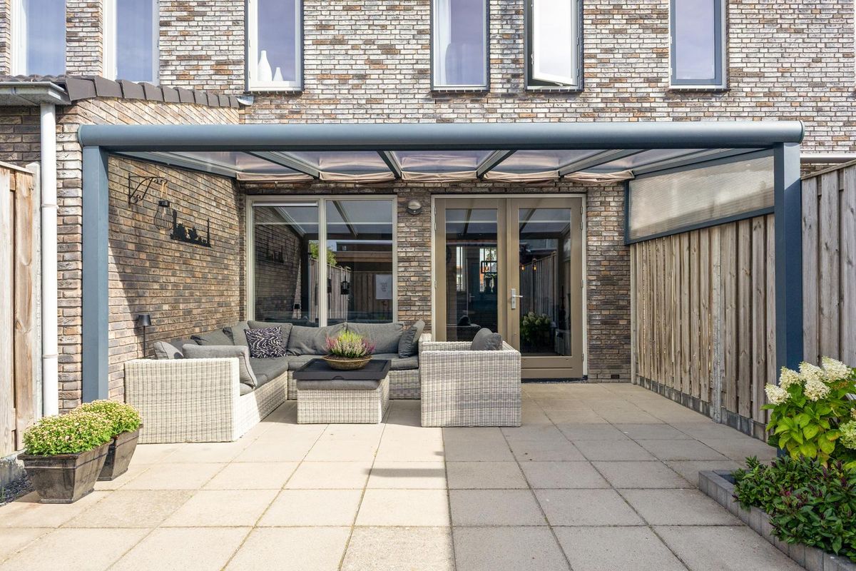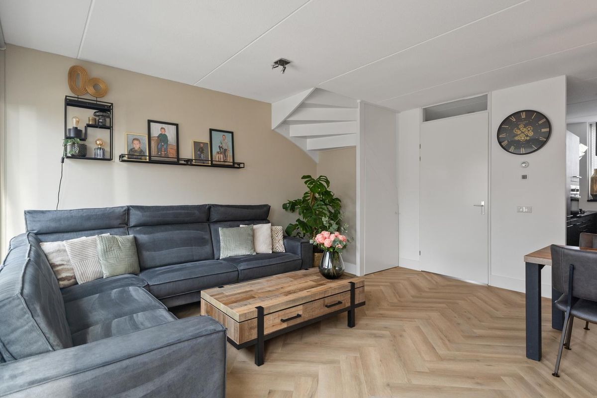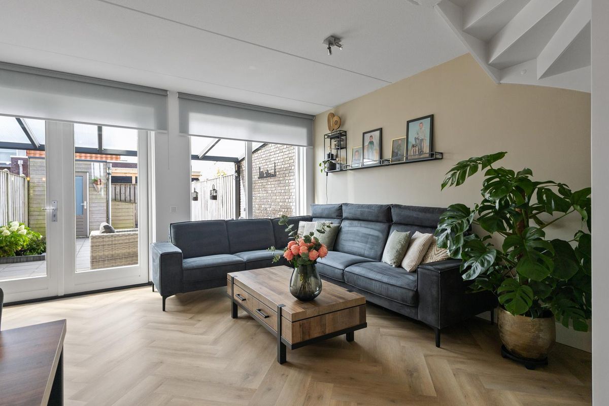 De woonkamer heeft een eigentijdse visgraat pvc-vloer, praktische trapkast en openslaande deuren richting de veranda/achtertuin. Een heerlijke plek waardoor je in het vroege voorjaar al beschut van het lentezonnetje kunt genieten. Achterin de tuin staat een houten (fietsen)berging en de tuin is middels een achterom bereikbaar.