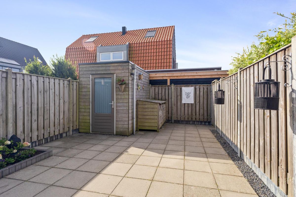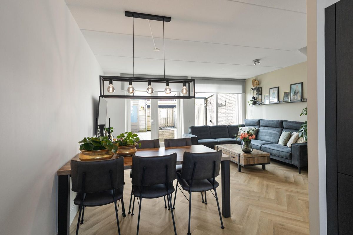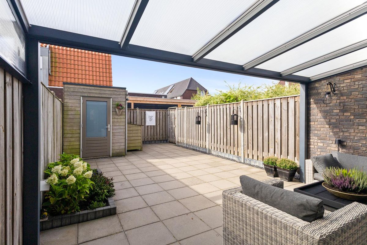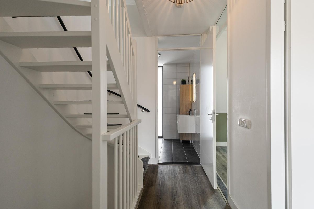 De woonkamer heeft een eigentijdse visgraat pvc-vloer, praktische trapkast en openslaande deuren richting de veranda/achtertuin. Een heerlijke plek waardoor je in het vroege voorjaar al beschut van het lentezonnetje kunt genieten. Achterin de tuin staat een houten (fietsen)berging en de tuin is middels een achterom bereikbaar.