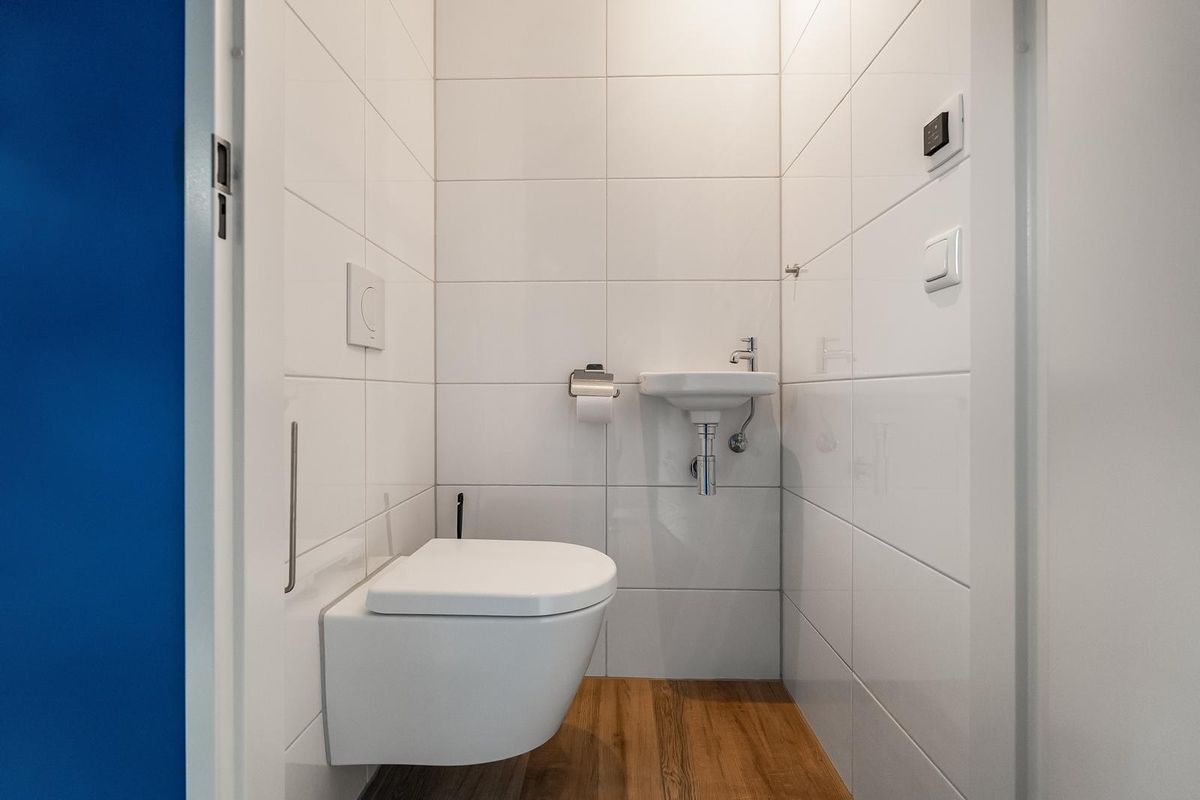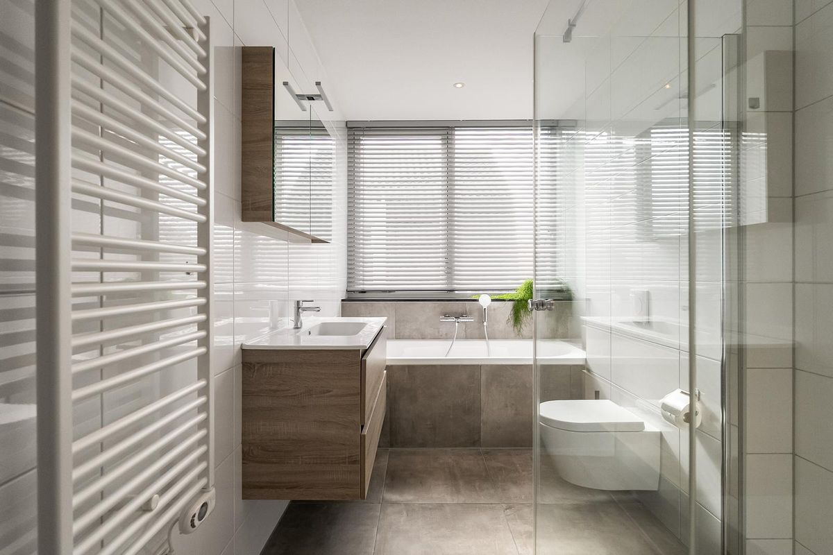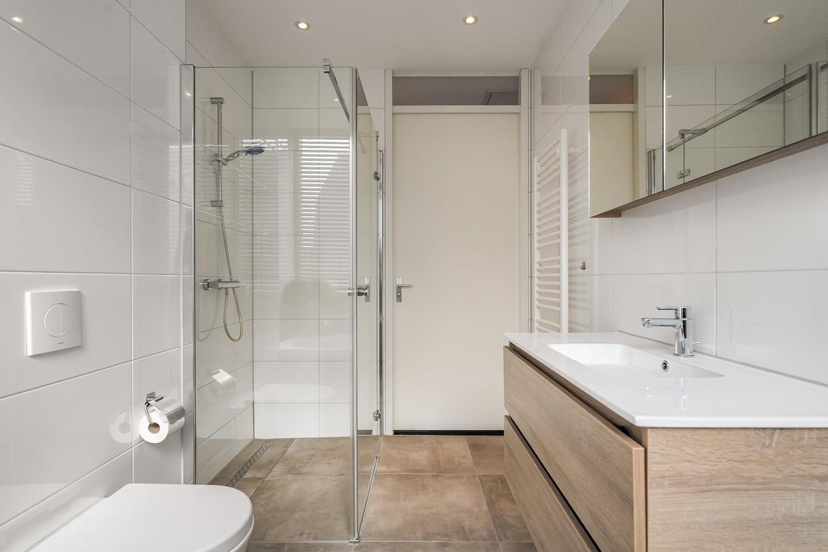 De badkamer is ook heerlijk licht en ingedeeld met een grote inloopdouche, ligbad, 2e vrijdragend toilet, wastafelmeubel, extra elektrische designradiator en vloerverwarming.