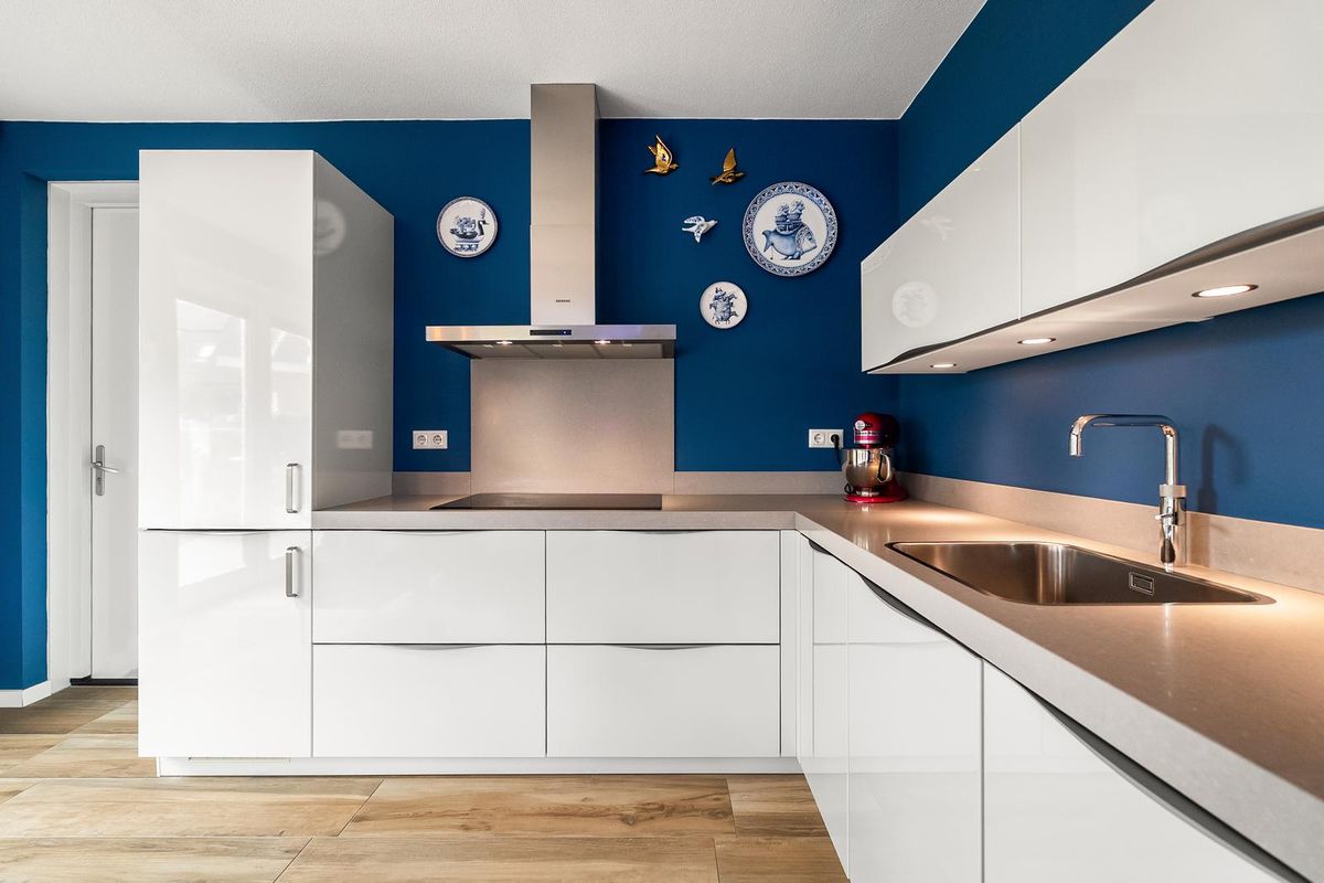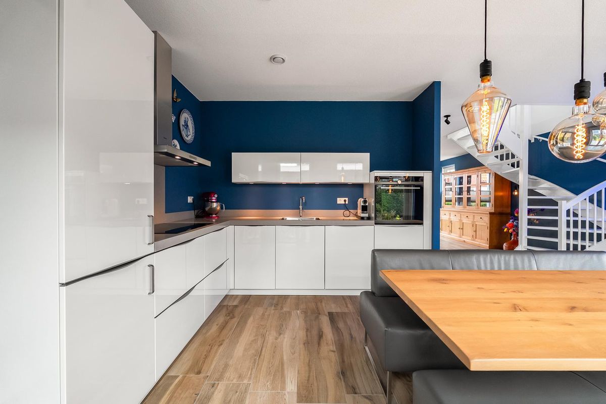 De keuken is voorzien van veel kastruimte en als inbouwapparatuur een koelkast, vrieskast, afzuigkap, inductiekookplaat, stoomoven en quoocker.
