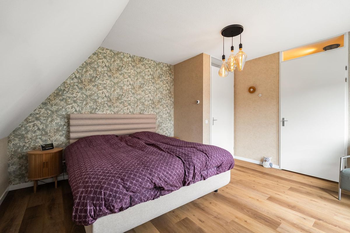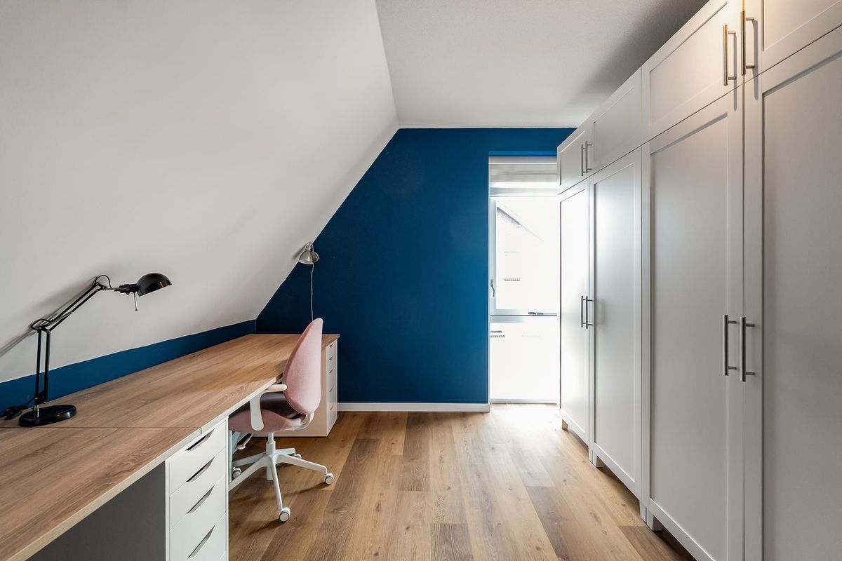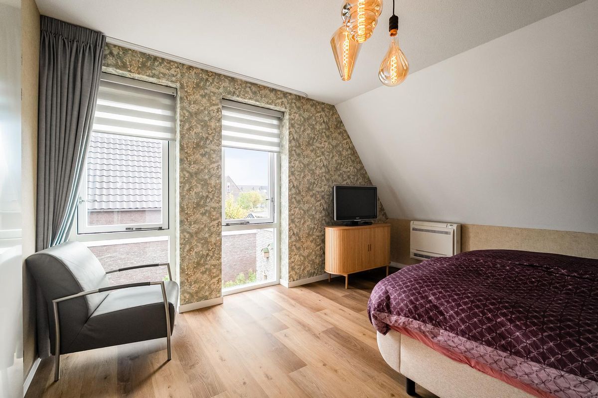Op de 1e verdieping lichte overloop door het grote raampartij. Aan de voorzijde twee slaapkamers en aan de achterzijde de hoofdslaapkamer met inloopkast en voor de warme zomers een airco-unit.