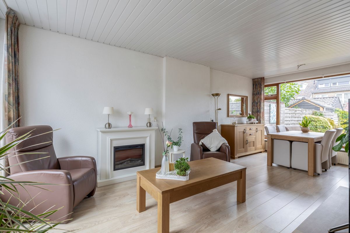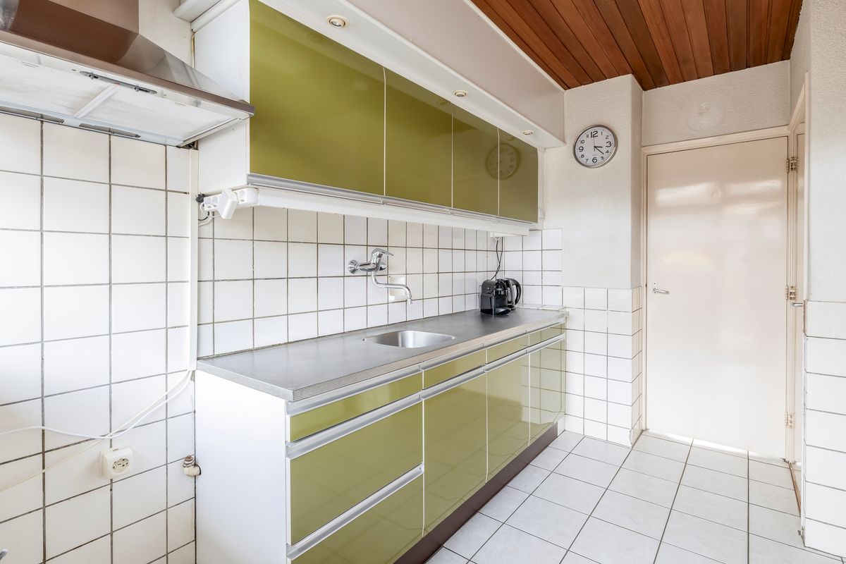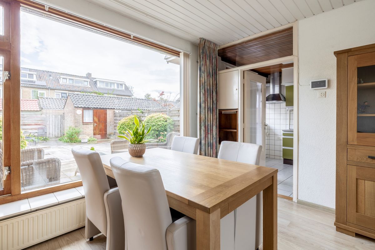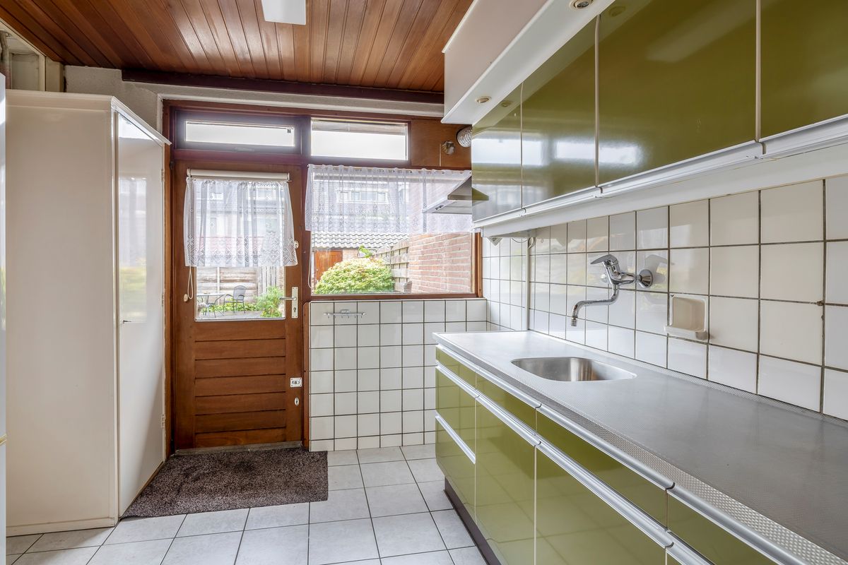 De woonkamer heeft veel lichtinval door de grote ramen. Vanuit de woonkamer kun je met een deur rechtstreeks naar de keuken. De keuken heeft een rechte opstelling van het keukenblok en is met 8,50m² oppervlak heel ruim. Er zijn twee inbouwkasten in de keuken aanwezig. Het gezamenlijk oppervlak van woonkamer en keuken bedraagt circa 32,00m². Vanuit de keuken is er een deur die toegang geeft tot de tuin.